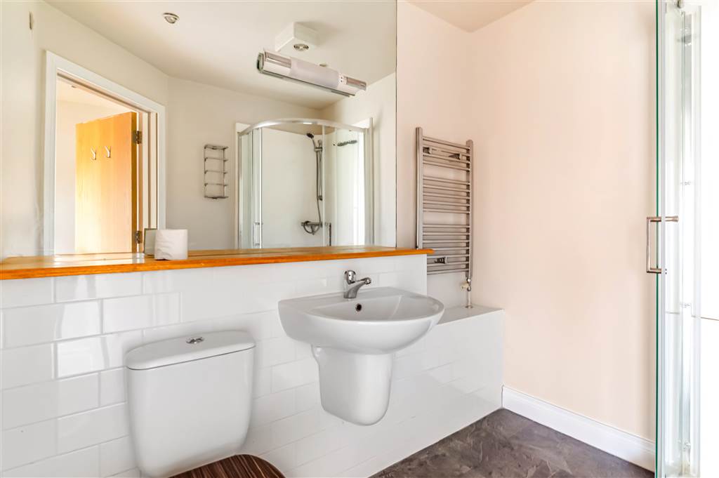 White suite comprising of shower enclosure, low flush w.c, 1/2 hand wash basin with mixer taps, partly tiled walls, ceramic tile flooring, recess spotlight, extractor fan.