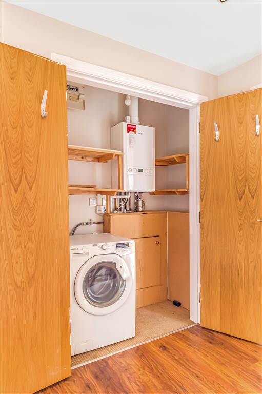 Laminate wood flooring, storage cupboard, plumbed for washing machine, gas fired central heating boiler.