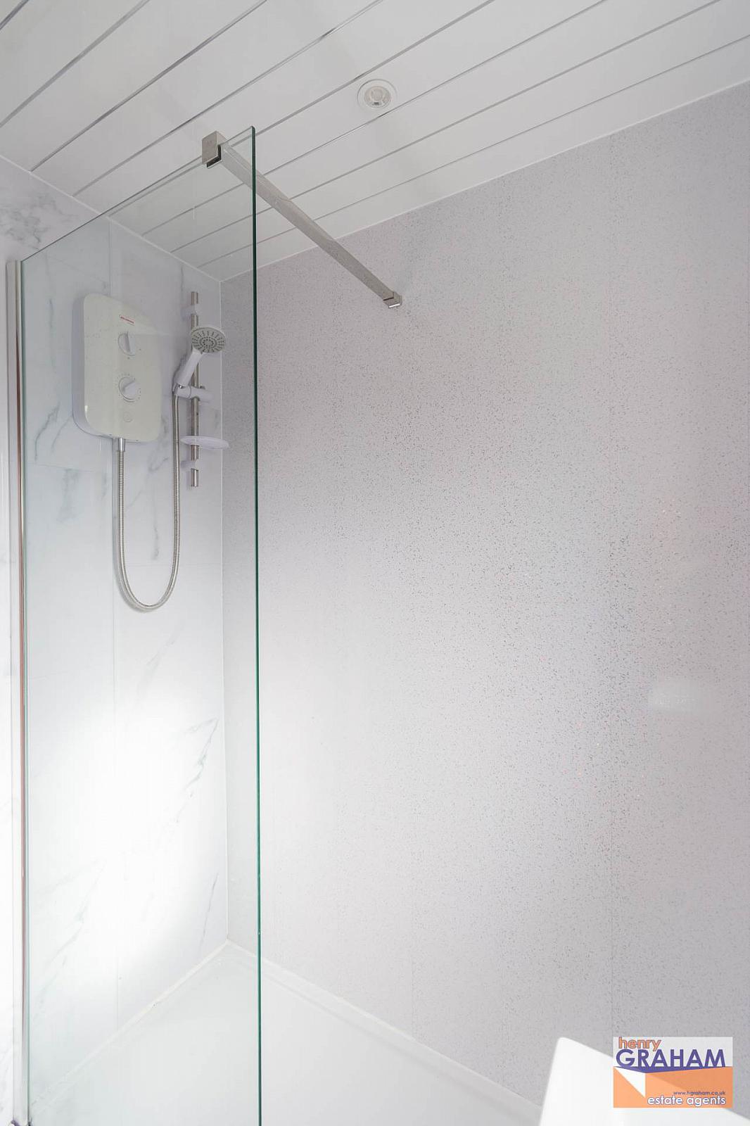 Walk in shower enclosure. Redring electric shower. Vanity unit with wash hand basin and mono style mixer tap. Close couple low flush WC. PVC panelled walls and ceiling with recessed spotlights. Chrome finish heated towel rail.