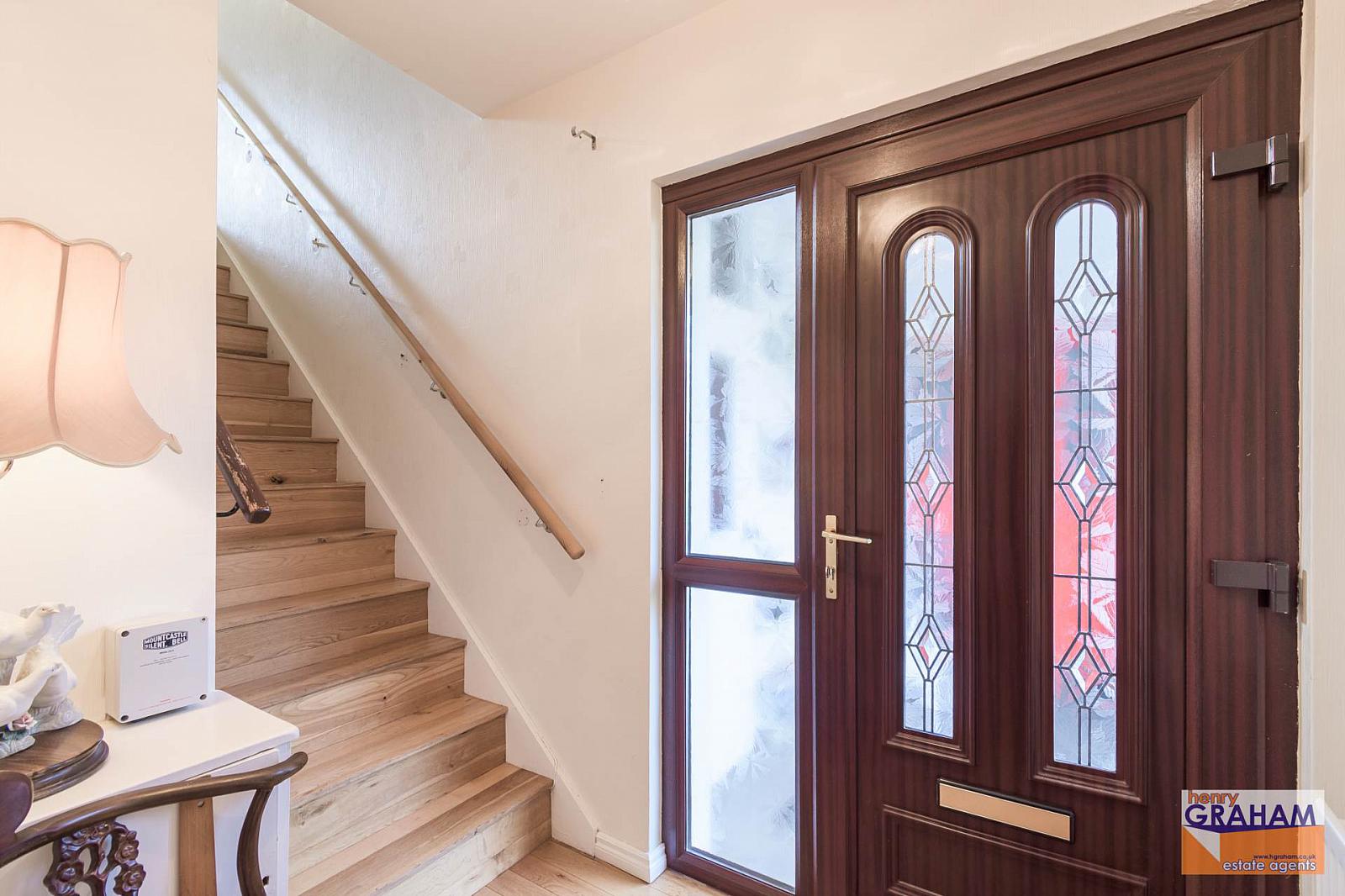 Mahogany effect PVC double glazed entrance door. Oak floor and oak staircase.