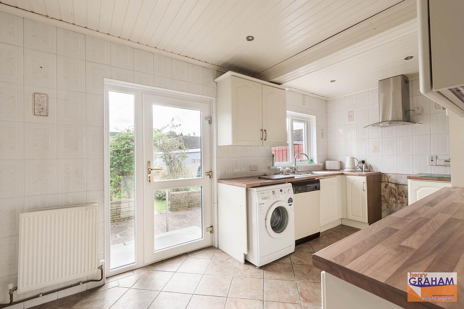 Range of high and low level units. Wood strip effect worktops. Bowl and a half stainless steel sink unit. Swan neck mixer tap. Tiled walls and tiled floor. PVC double glazed back door leading to south facing paved patio area and rear garden. Plumbed for washing machine. Recessed spotlights. Hotpress under stairs.