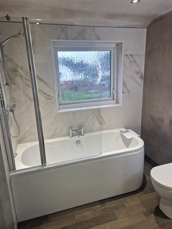 Modern Family Bathroom Comprising Bath with Shower Over, Low Flush WC and Wash Hand Basin (less that a year old)