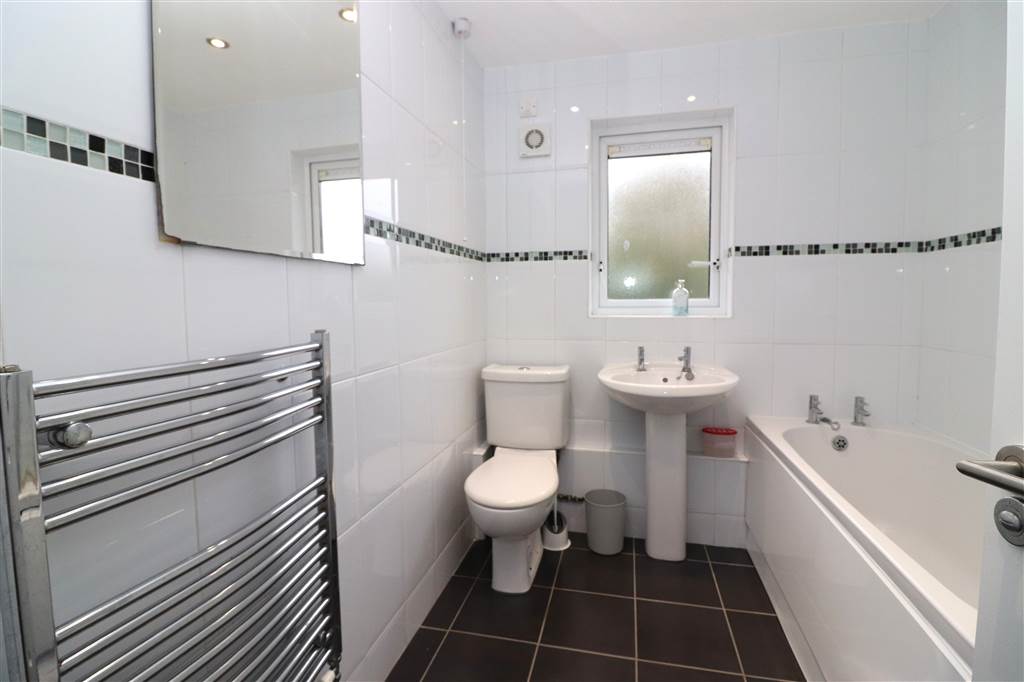 White suite. Panelled bath with Mira sport electric shower and shower screen. Pedestal wash hand basin. Low flush WC. Fully tiled. Recessed lights. Extractor fan. Heated chrome towel rail.