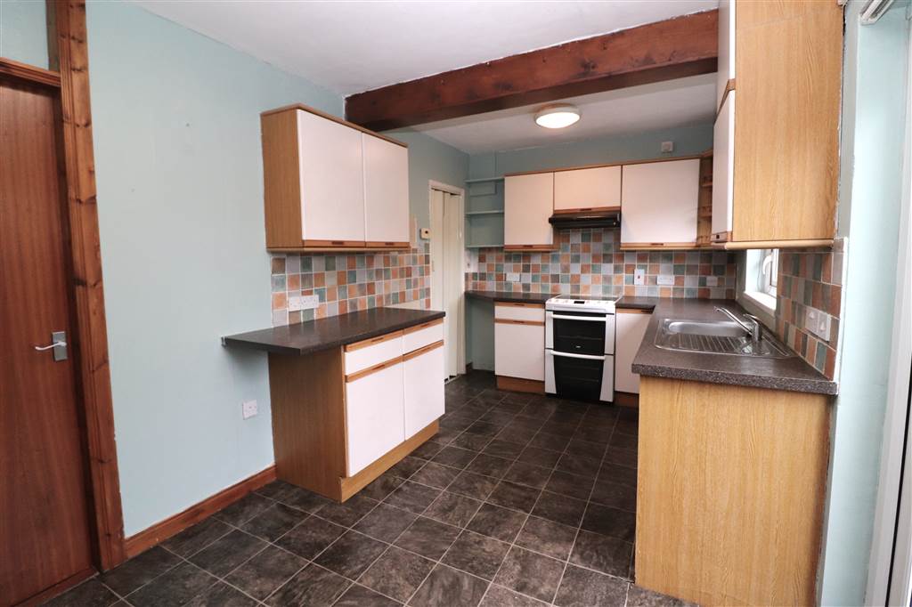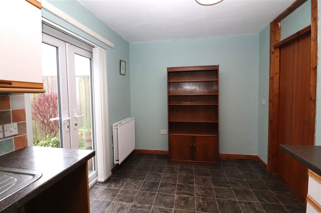 Good range of high and low level units. Single drainer stainless steel sink unit. Plumbed for washing machine. Electric cooker circuit. Cooker filter. Part tiled walls. Understairs storage cupboard. UPVC french doors to rear garden.