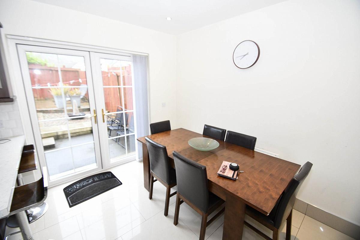 Upon entering, you are welcomed into a spacious reception room, bathed in natural light, providing a warm and inviting space for relaxation or entertaining guests. The heart of the home is the kitchen and dining area, thoughtfully designed to create a seamless flow. The kitchen boasts ample storage and work surfaces, while the dining area benefits from double doors that open directly onto the rear garden, allowing for effortless indoor-outdoor living and plenty of natural light.