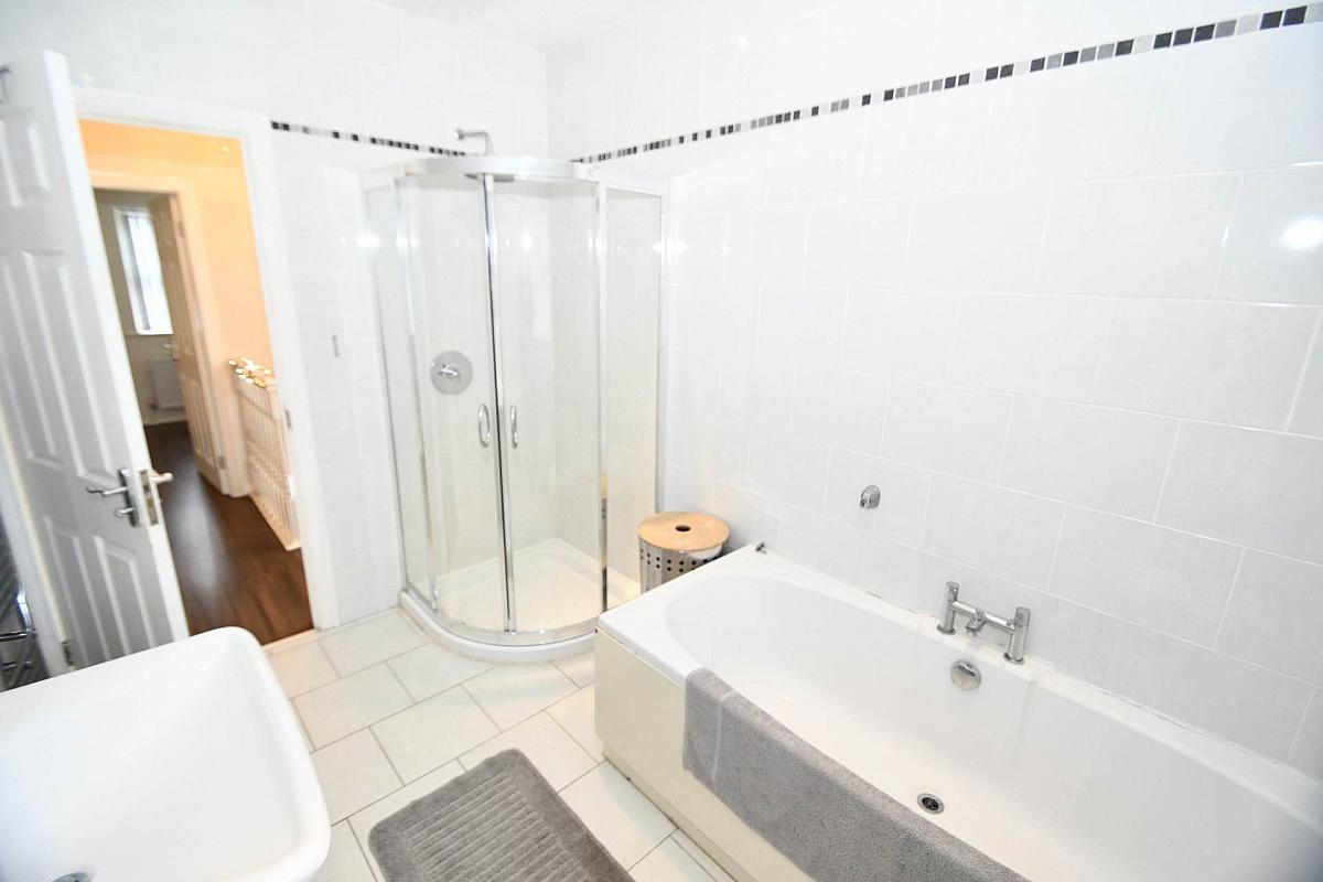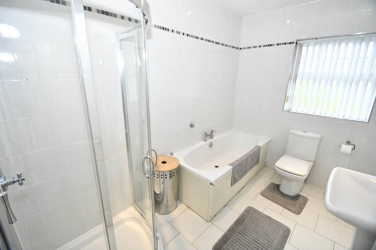 White family bathroom suite with panel bath & separate walk in corner shower cubicle, pedestal wash hand basin, low flush W/C, fully tiled walls, ceramic tiled flooring