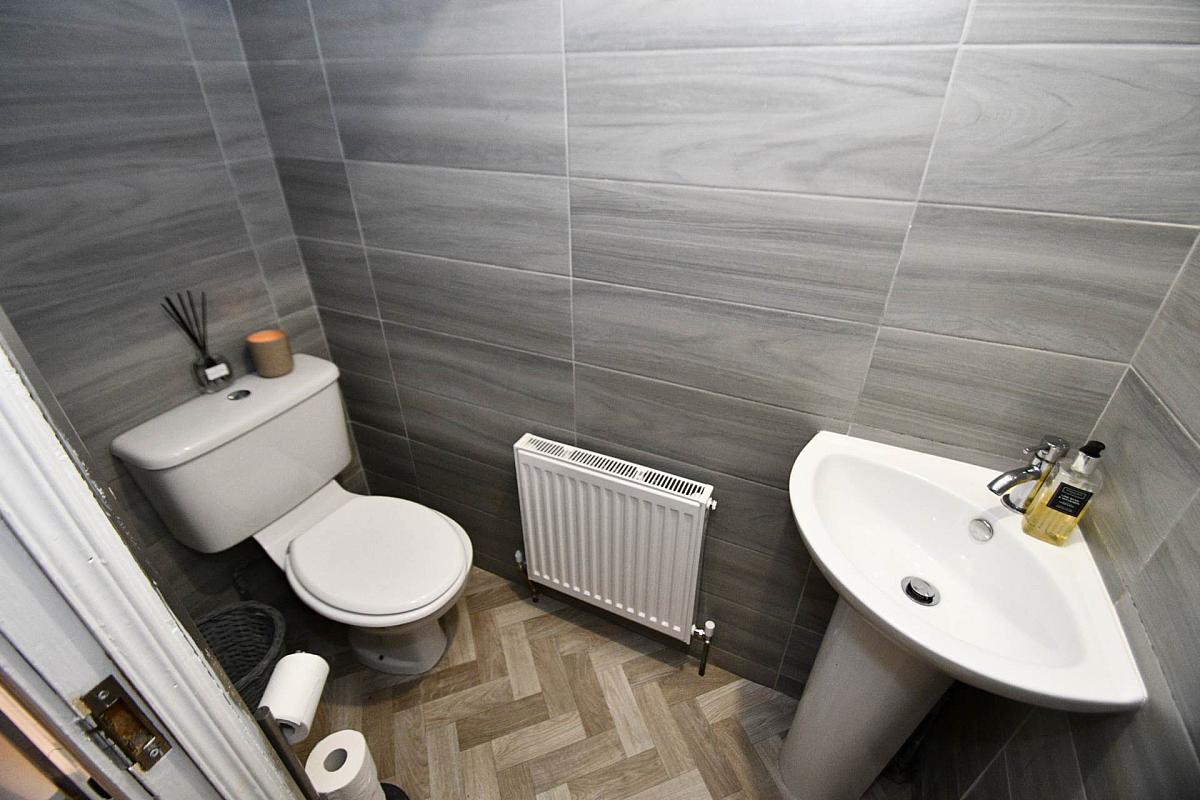 Low flush W.C, Pedestal wash hand basin and fully tiles walls.