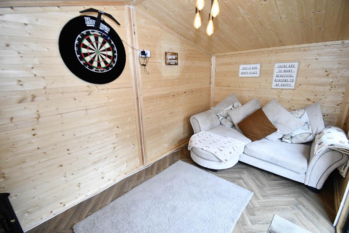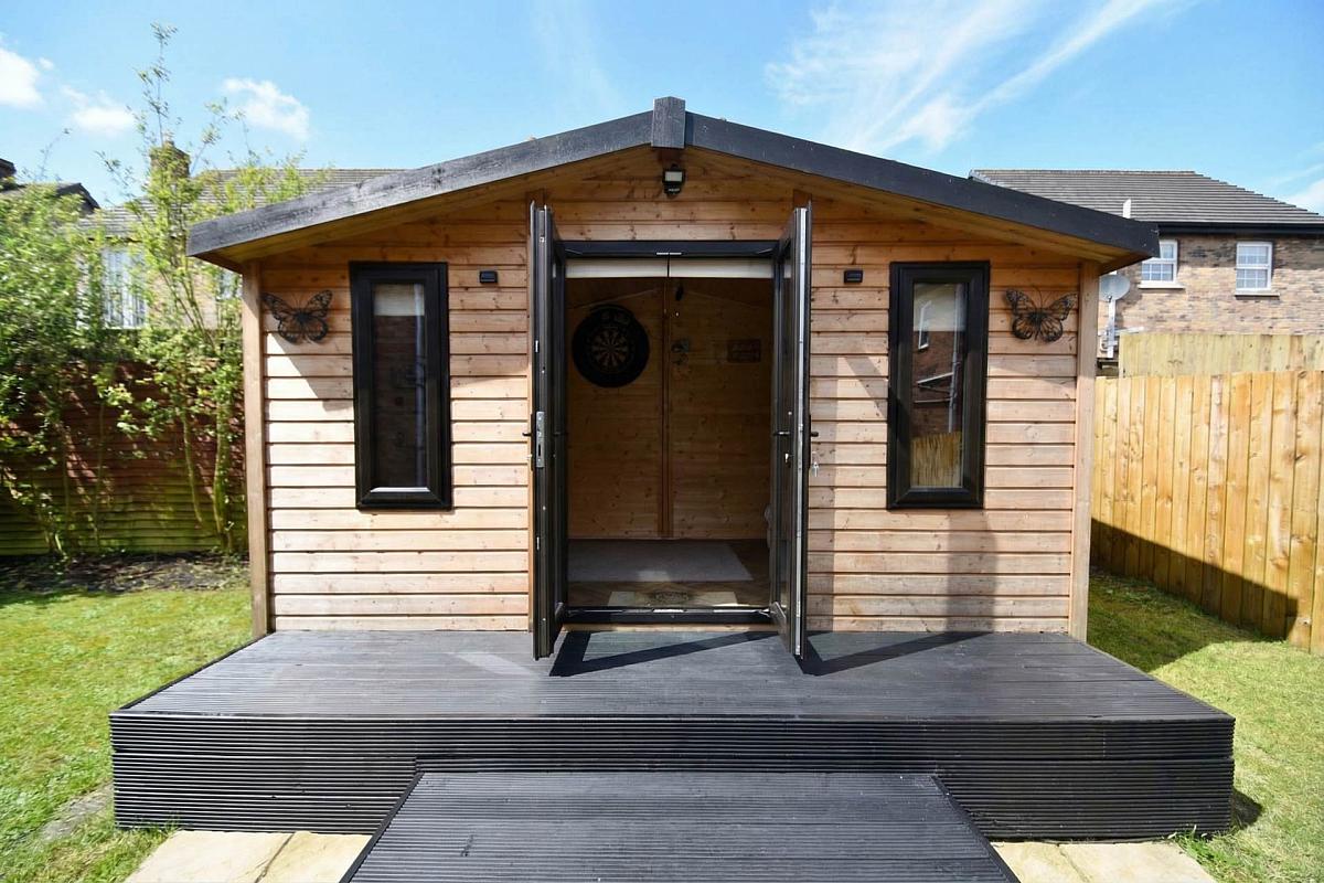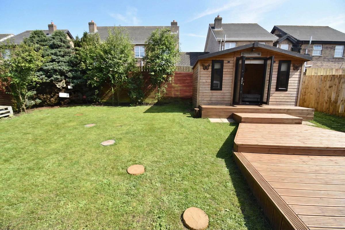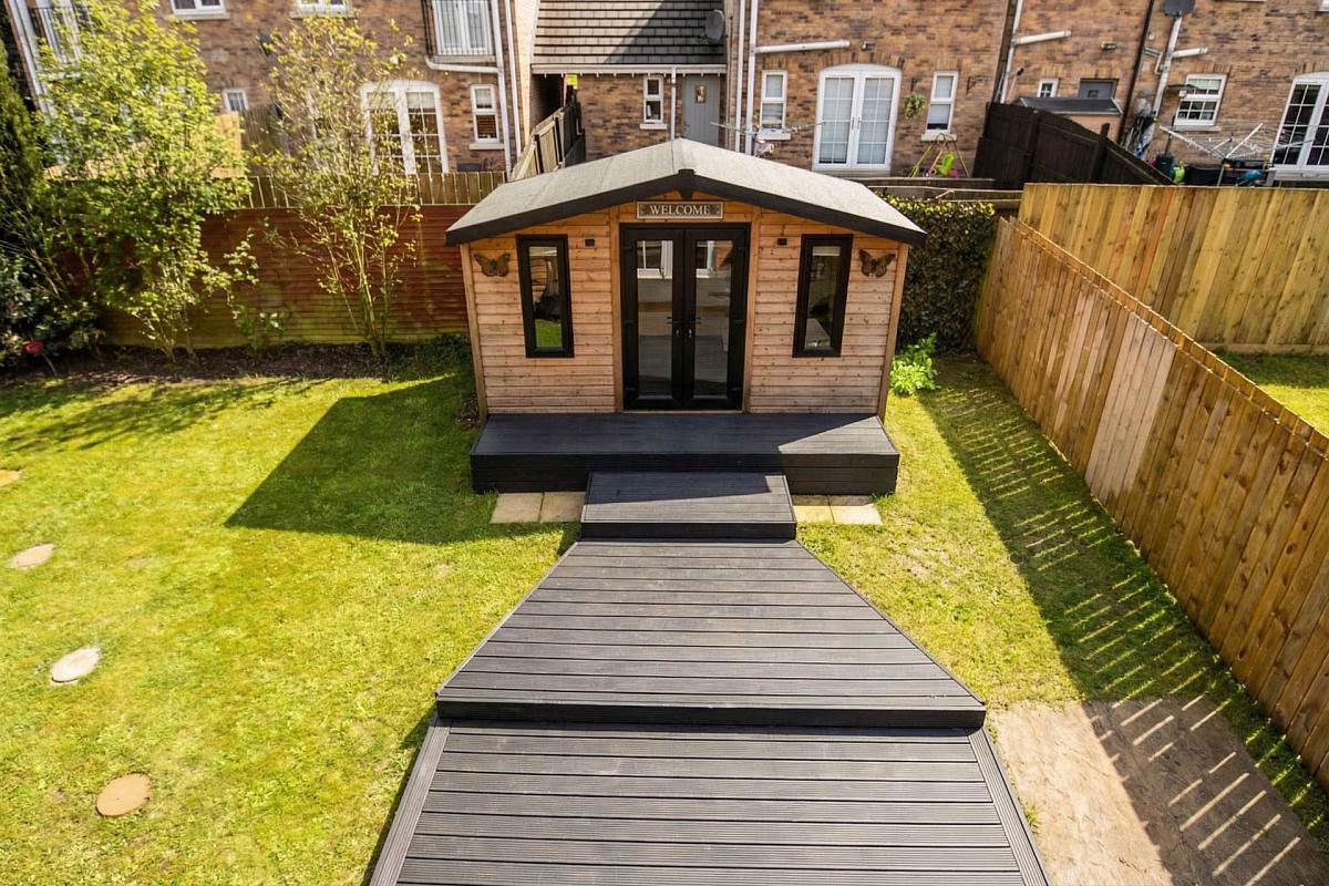 Garden in lawn, Decking, Large shed.