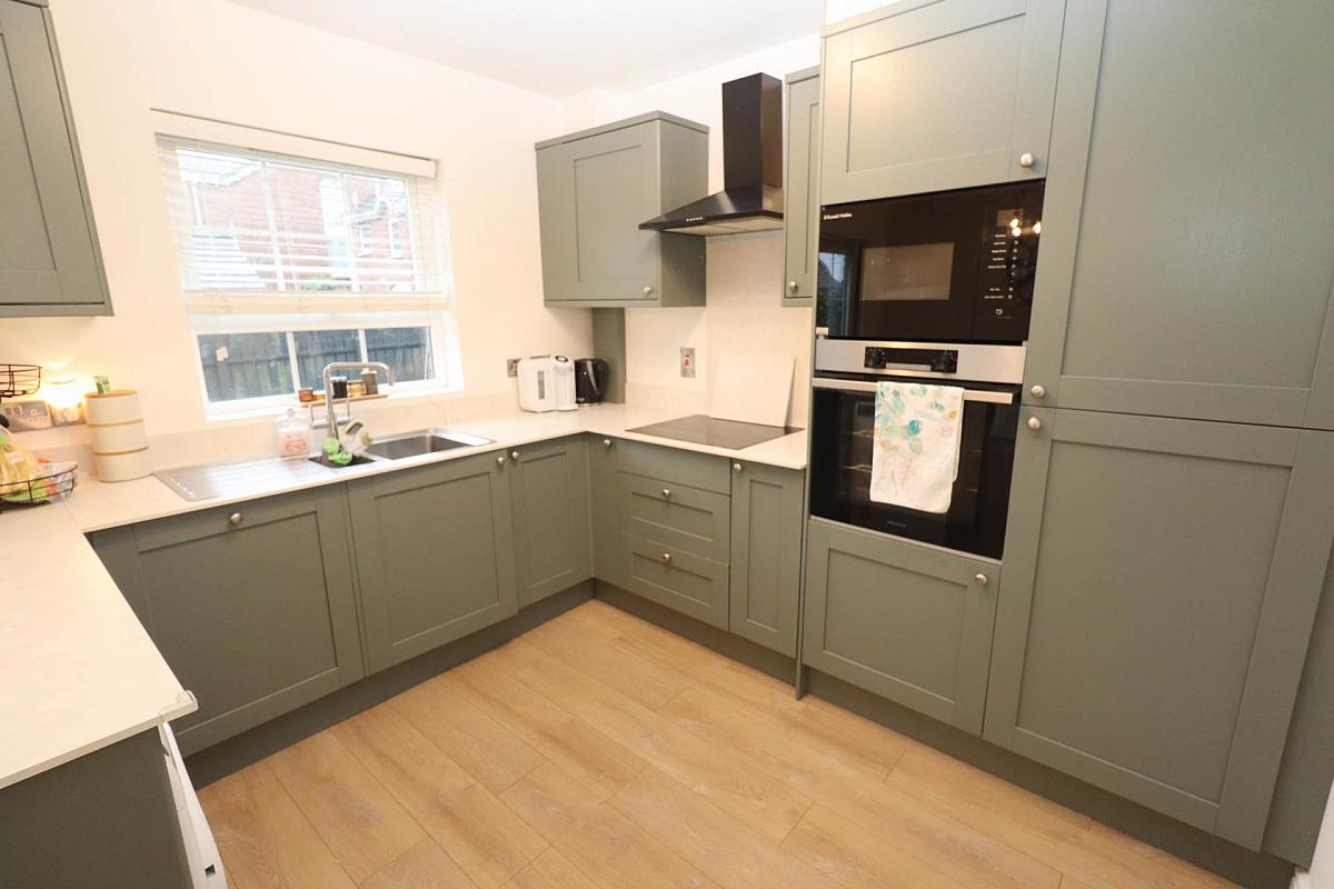 Fitted kitchen with a range of high and low level units, formica work surfaces, 1 1/2 bowl stainless steel sink unit, ceramic hob with overhead stainless steel extractor fan, built in oven and microwave, integrated dishwasher, integrated fridge and freezer, plumbed for washing machine, laminate floor and upvc double doors leading to the rear.