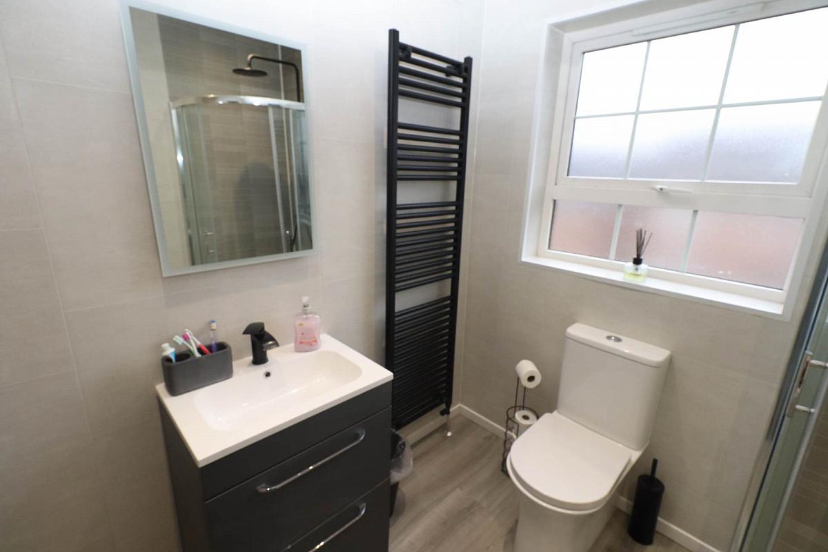 Low flush W.C, vanity wash hand basin, laminate floor.