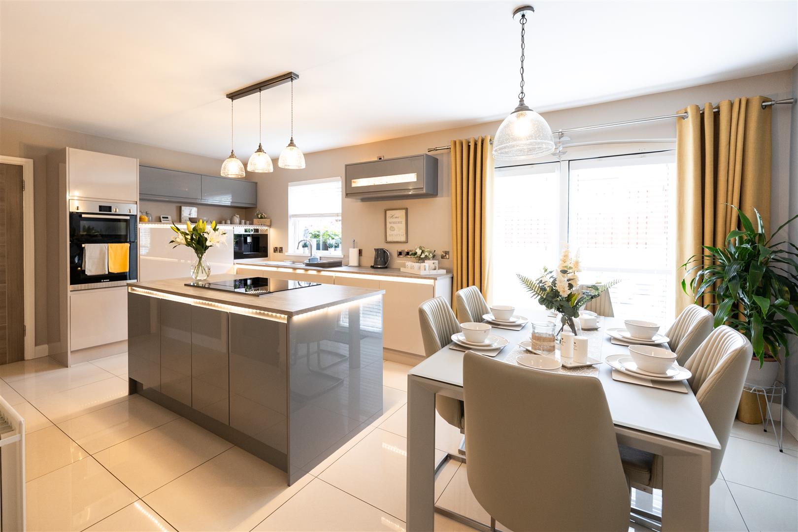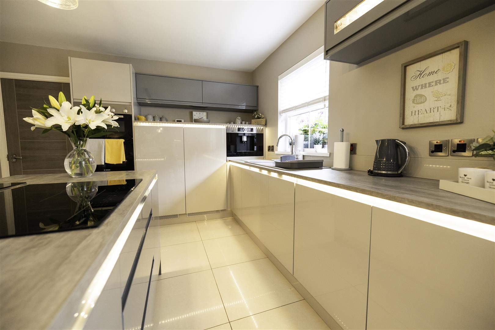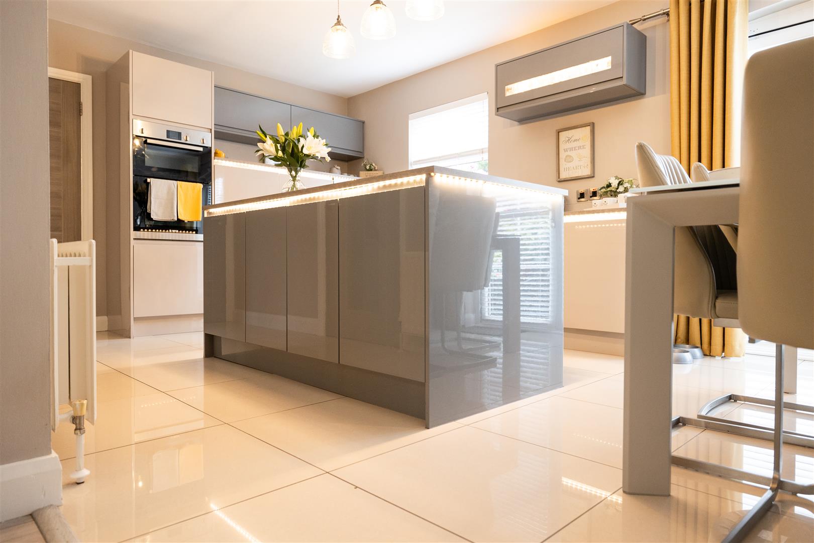 The kitchen is approx 5 years old and has a range of gloss taupe and cashmere fitted soft closure units, stone effect worktops, a central island and a range of integrated appliances. Double doors open up onto the landscaped rear garden. The kitchen dining room, opening into the main living room is the perfect layout for both modern living and entertaining.