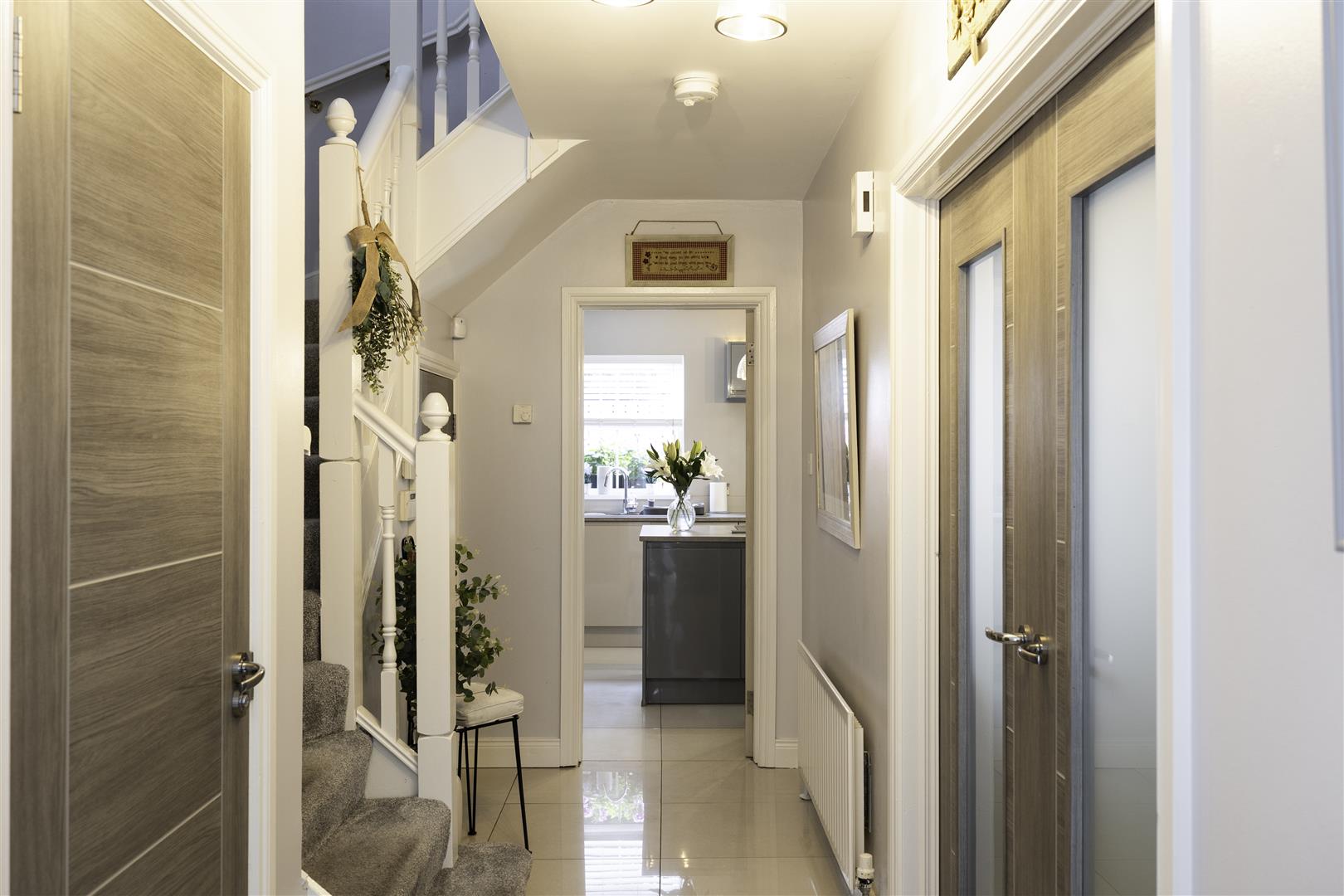 Upvc double glazed door to front with glazed side panels, tiled flooring, radiator, cloaks storage under stairs, double doors to living room, door to kitchen and door to wc