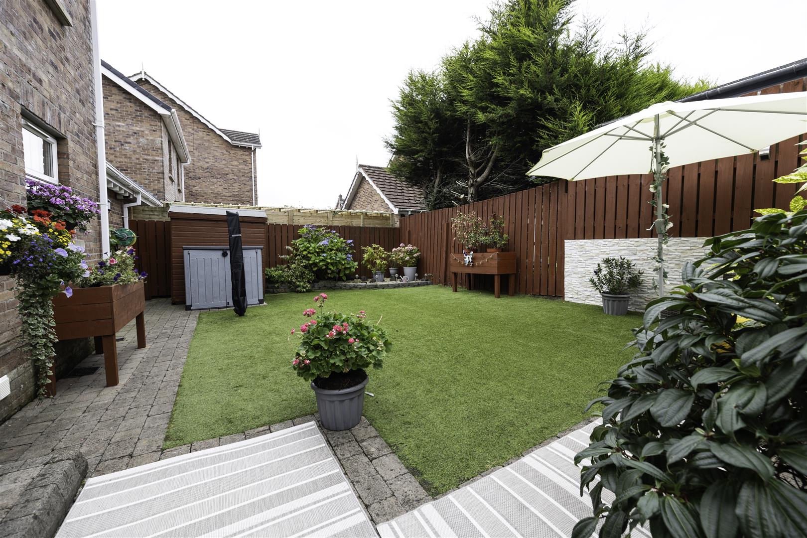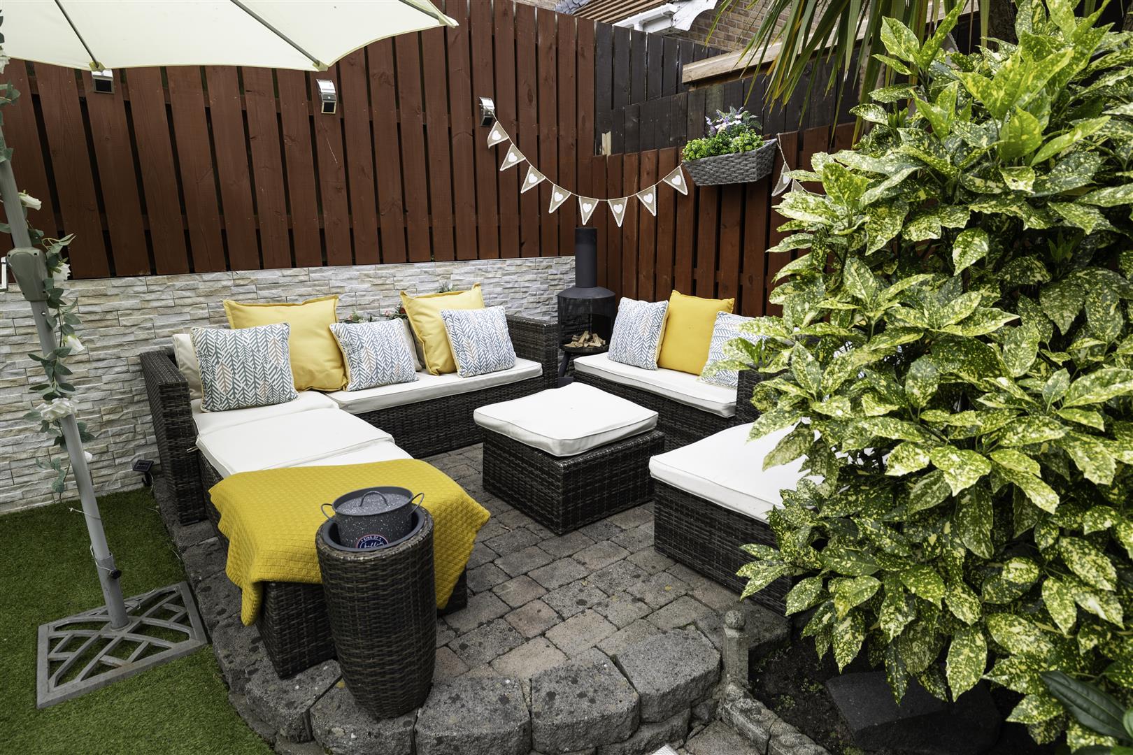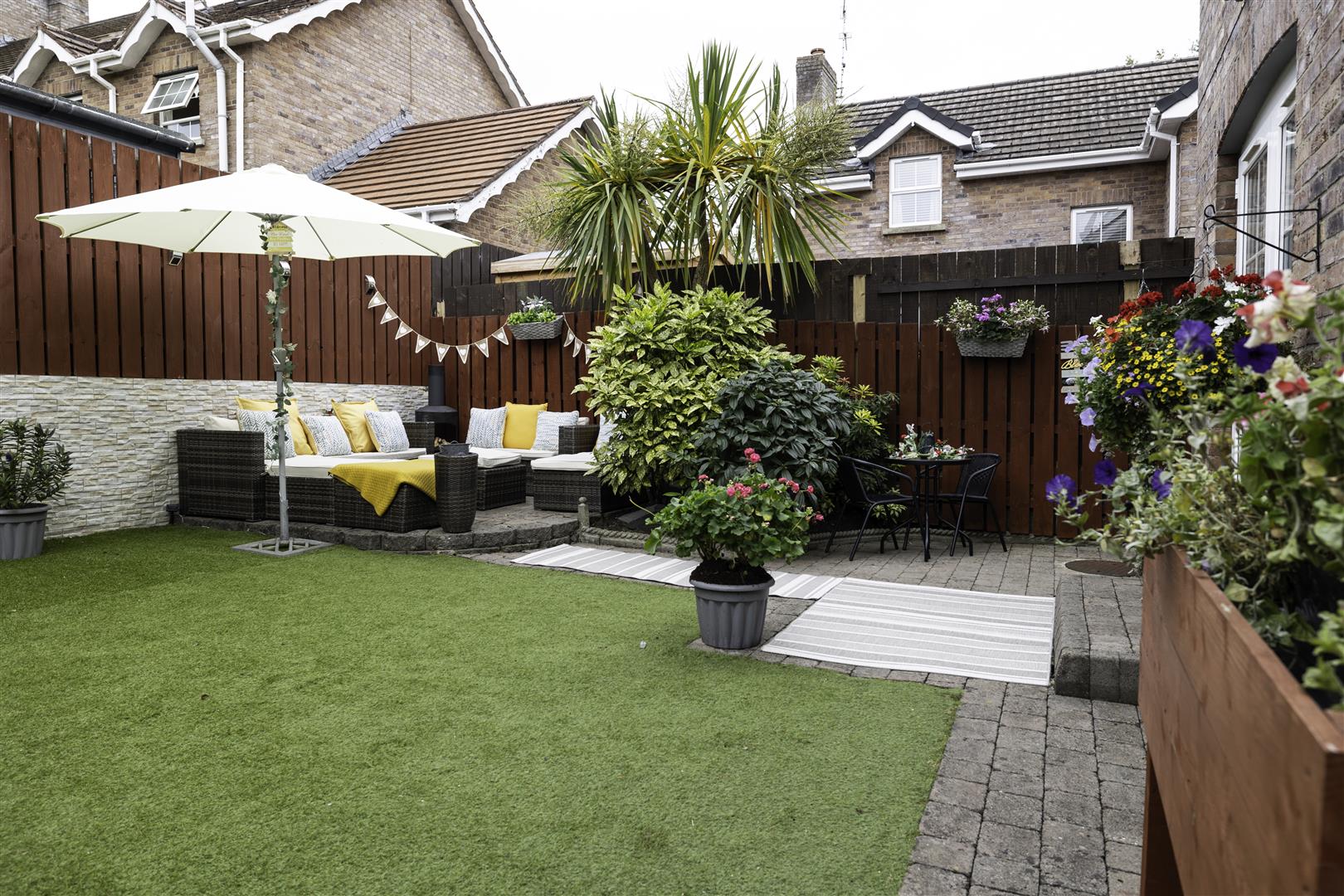 Rear: Landscaped garden with low maintainence artificial grass, block paved patio and raised seating area
