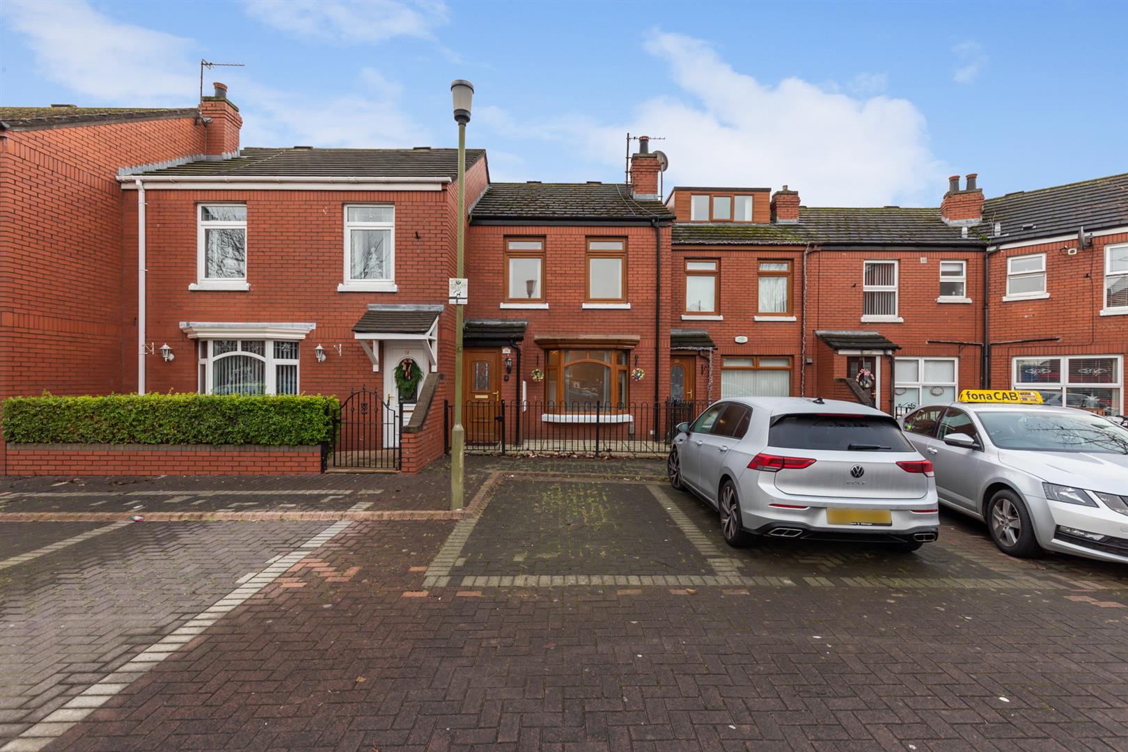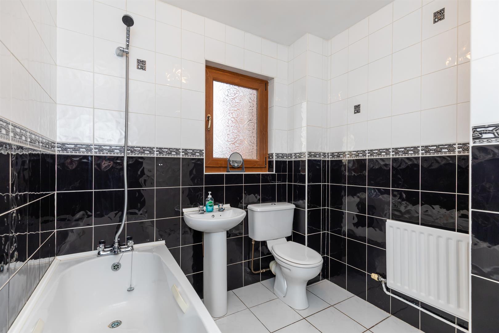 On the first floor are two well-proportioned bedrooms, both finished with laminate wooden flooring, with a built-in robe to the main bedroom. The bathroom is fitted with a white suite comprising a panelled bath with mixer tap and telephone hand shower, pedestal wash hand basin and low flush WC, with fully tiled walls and floor.