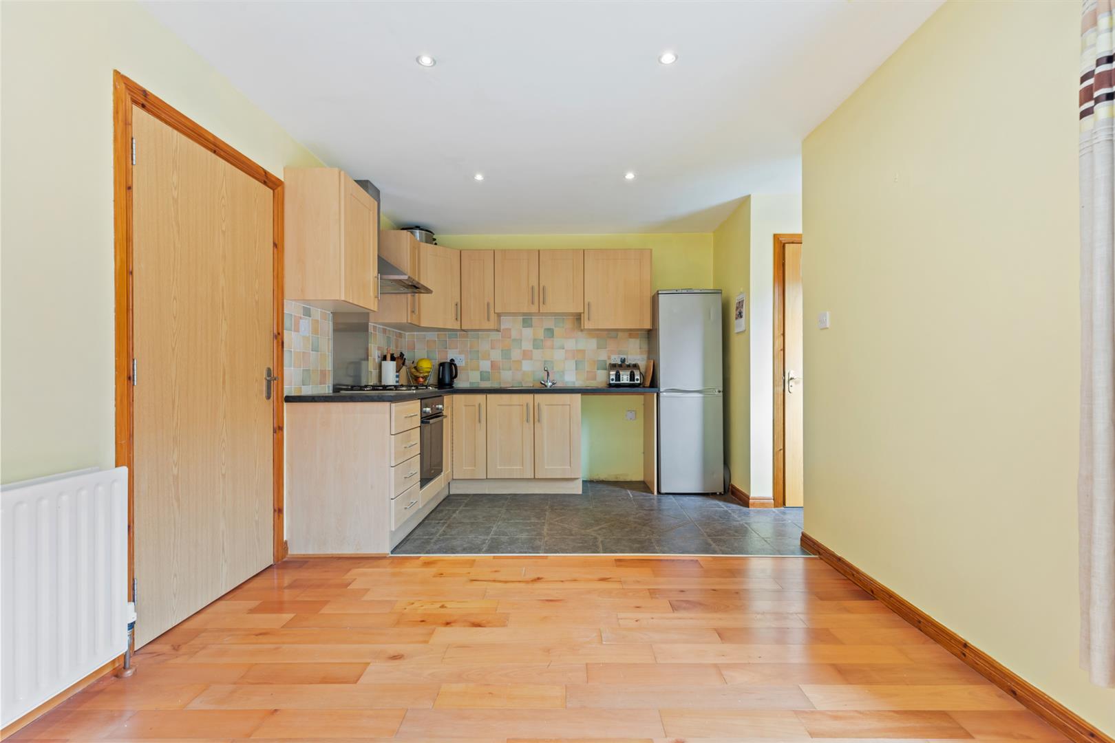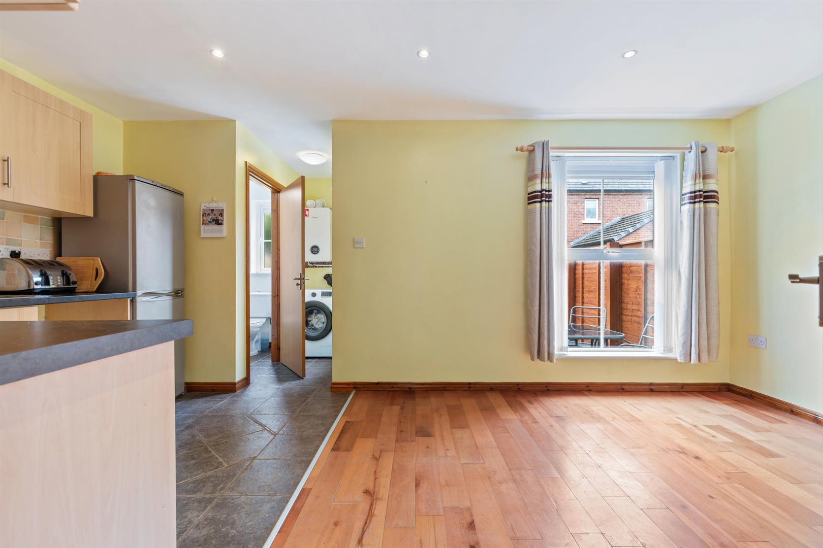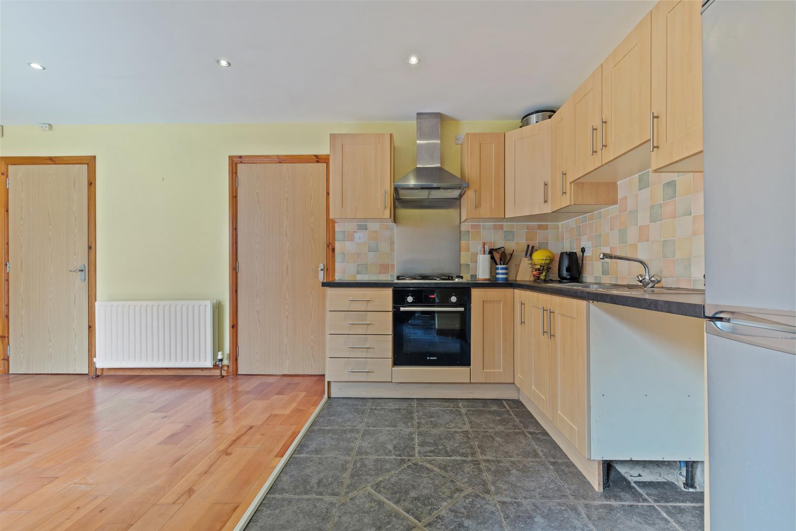 Excellent range of high and low level units, single drainer stainless steel sink unit with mixer tap, built in under oven and four ring gas hob, part tiled walls, tiled flooring to kitchen area. Laminate wooden flooring to dining area, recessed spotlighting.