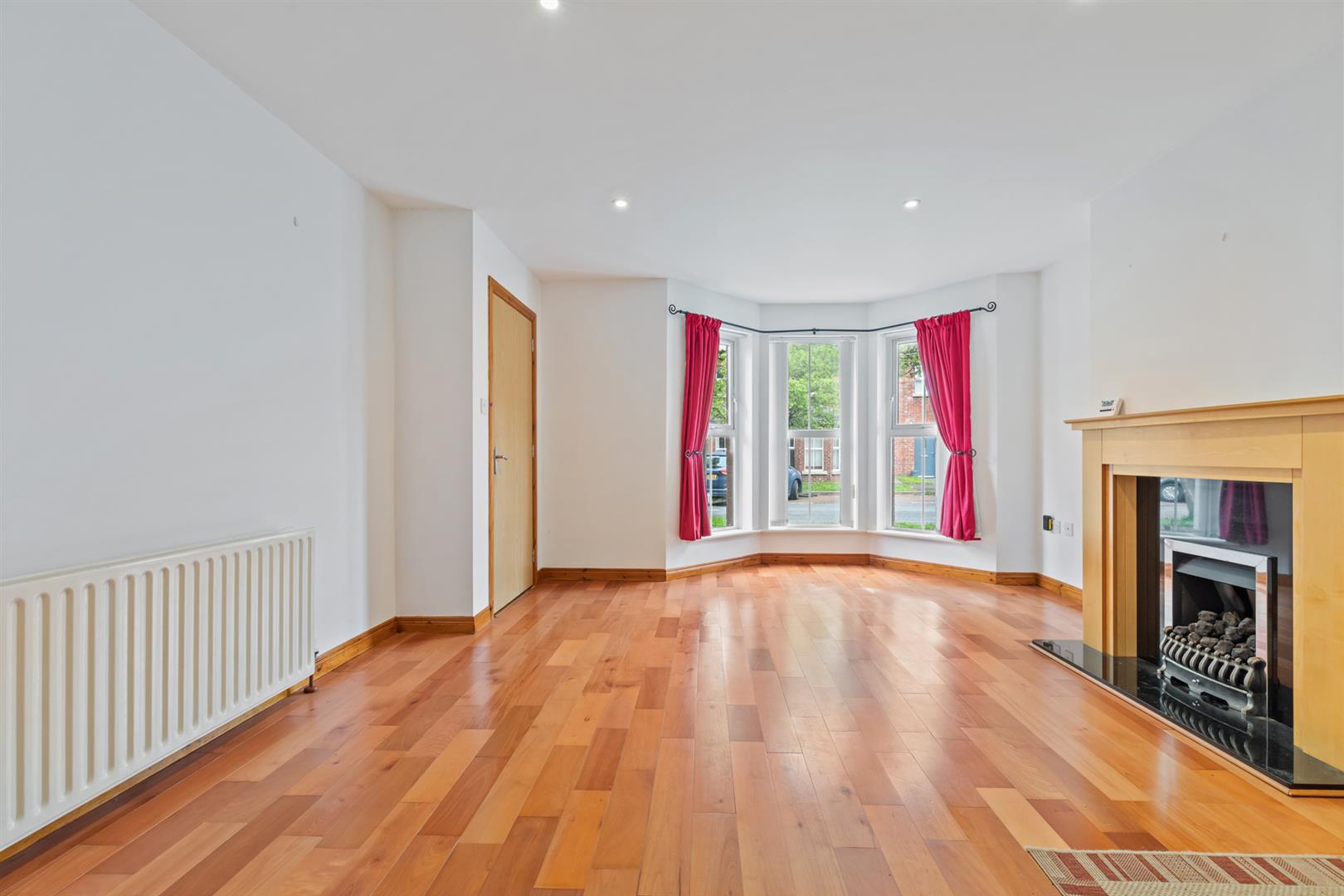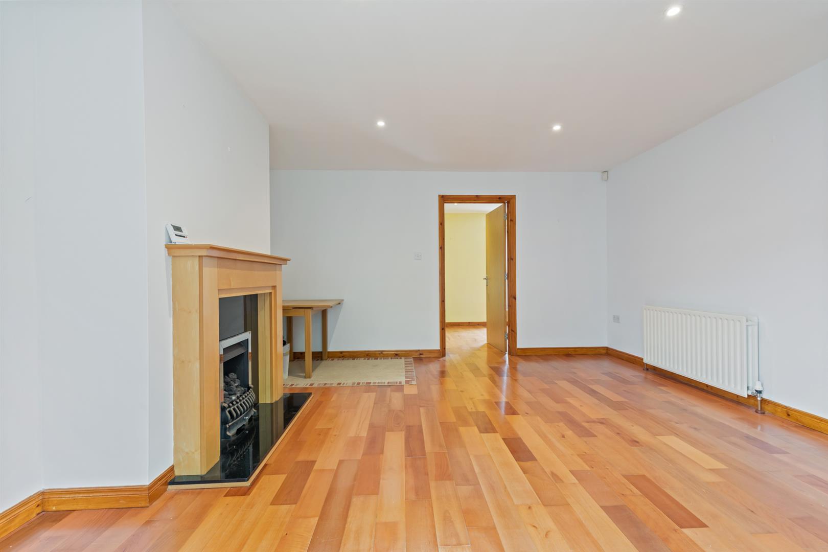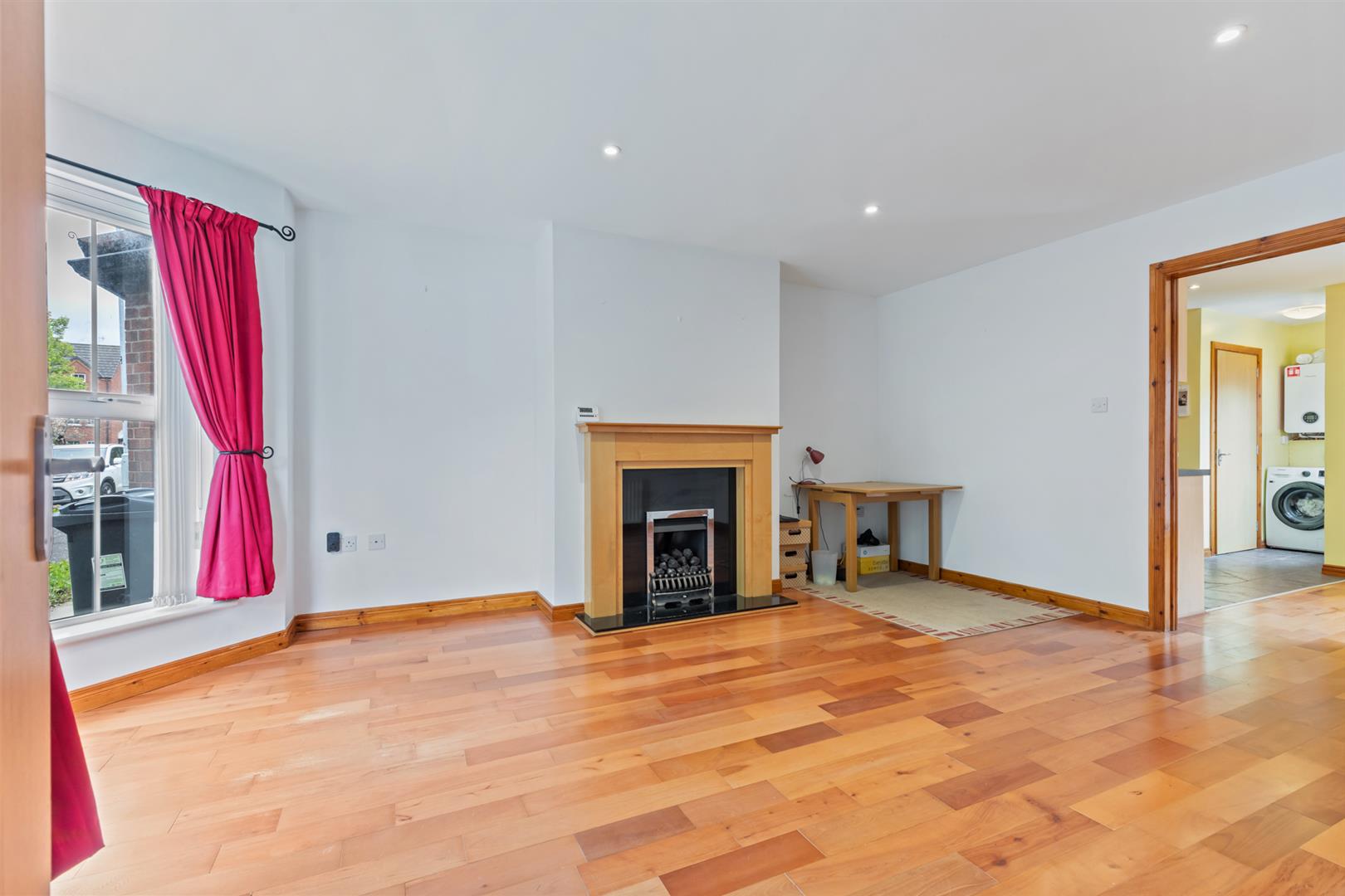 Laminate wooden flooring, attractive fireplace with gas fire and marble effect hearth, recessed spotlighting.