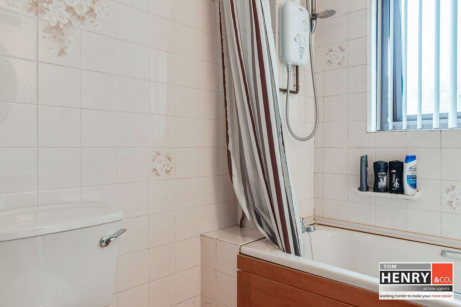 BATH WITH ELECTRIC SHOWER OVER. WASH HAND BASIN. TOILET. TILED WALLS. TILED FLOOR.
