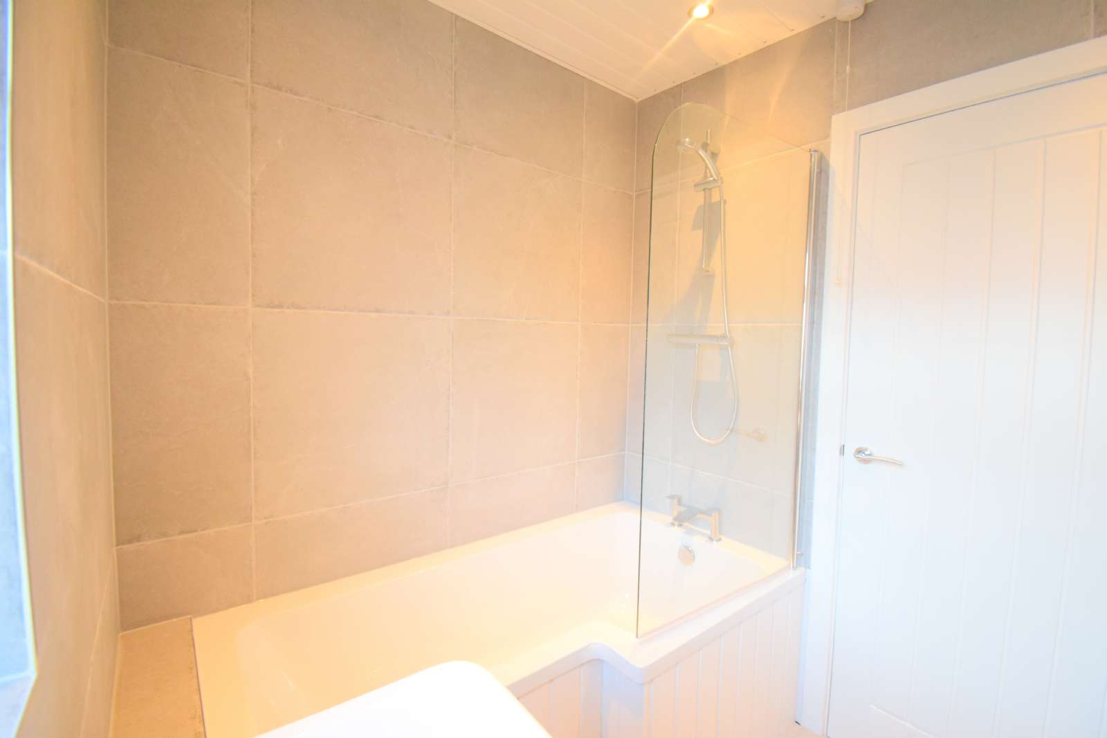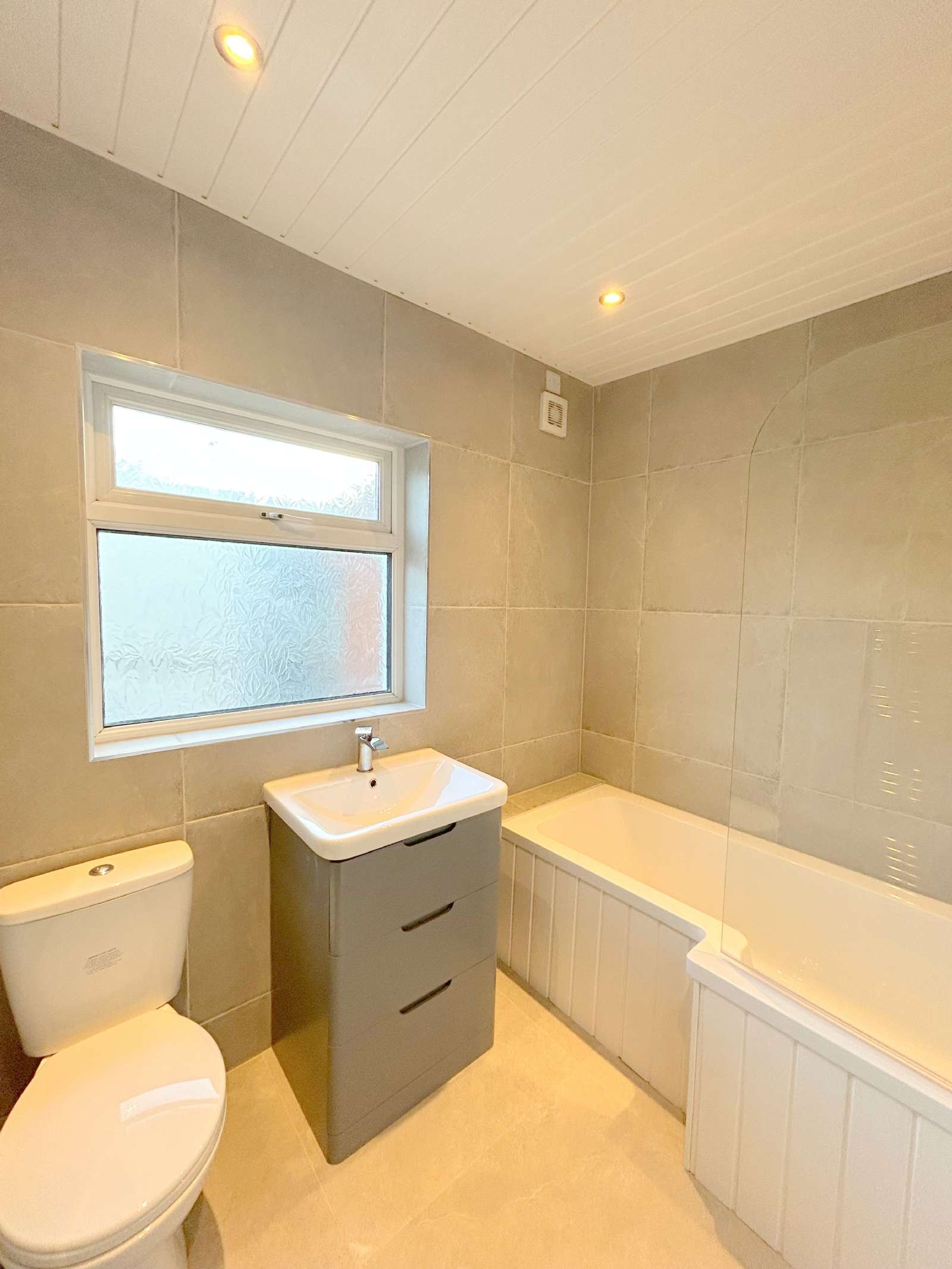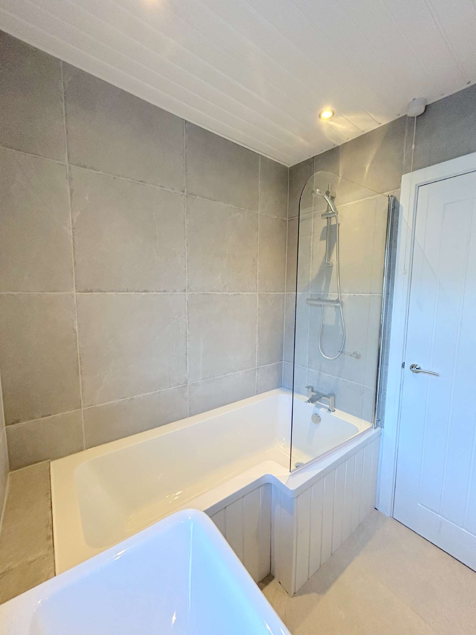 - Modern three-piece bathroom, consisting of a shower over bath, sink and vanity unit, low flush WC and a heated chrome towel rail, laid in polished porcelain grey marble tiles and marble effect wall panelling.