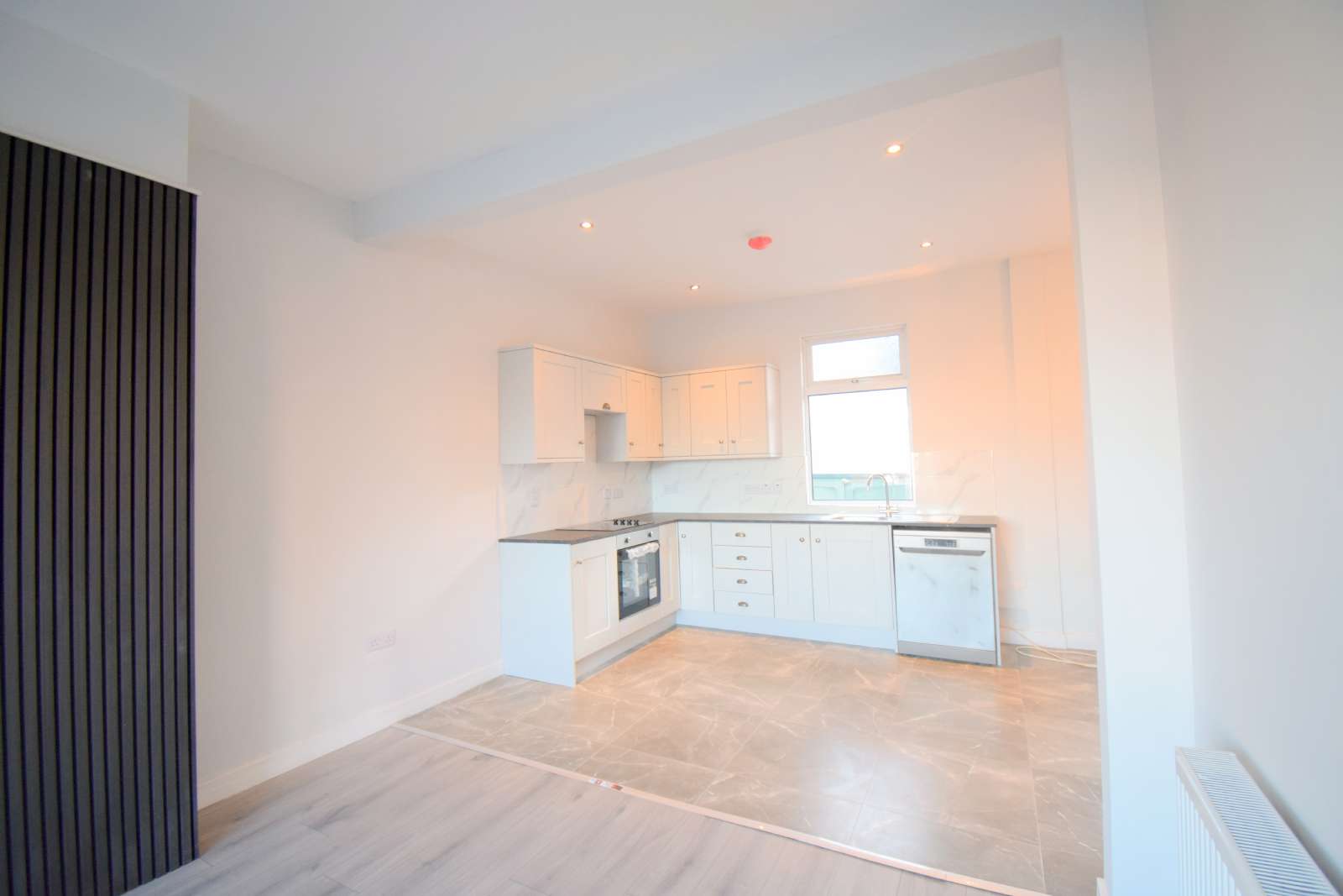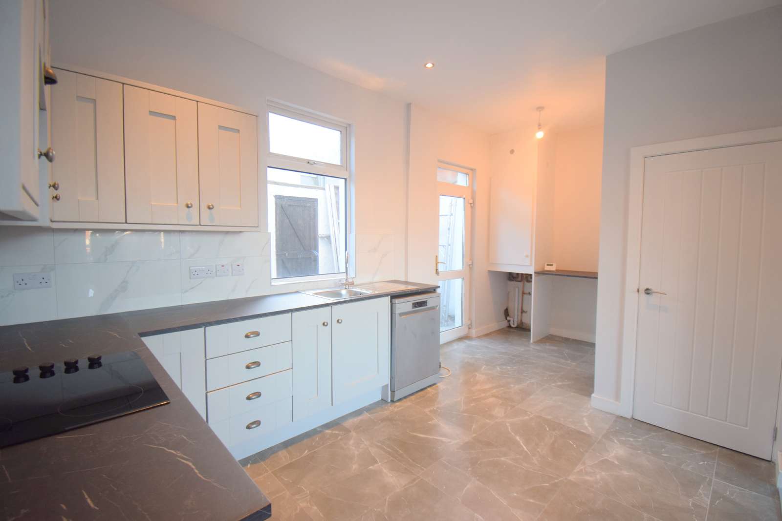 - Newly Fitted, modern light grey kitchen, with silver hardware, charcoal marble affect work tops, floor laid in grey marble effect floor tiling. This kitchen features an integrated oven/hob/hood, an array of high and low level units with space for a fridge freezer and access to the private rear yard.