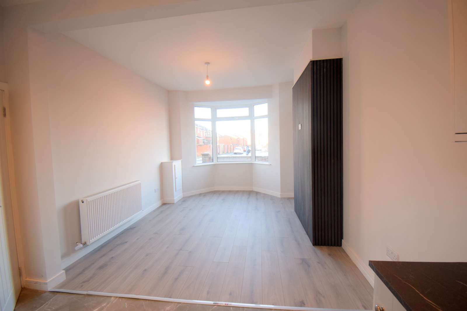 - Spacious Living Area, laid in grey laminate wooden flooring, with feature media wall panelling and a feature bay window, open to;