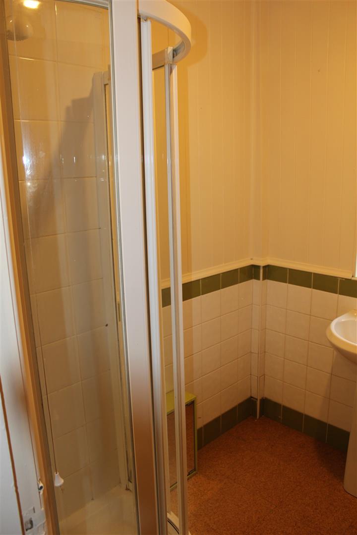 The bathroom has a low flush WC, pedestal sink and shower, it is partially tiled with a small uPVC letting the natural light flood in.