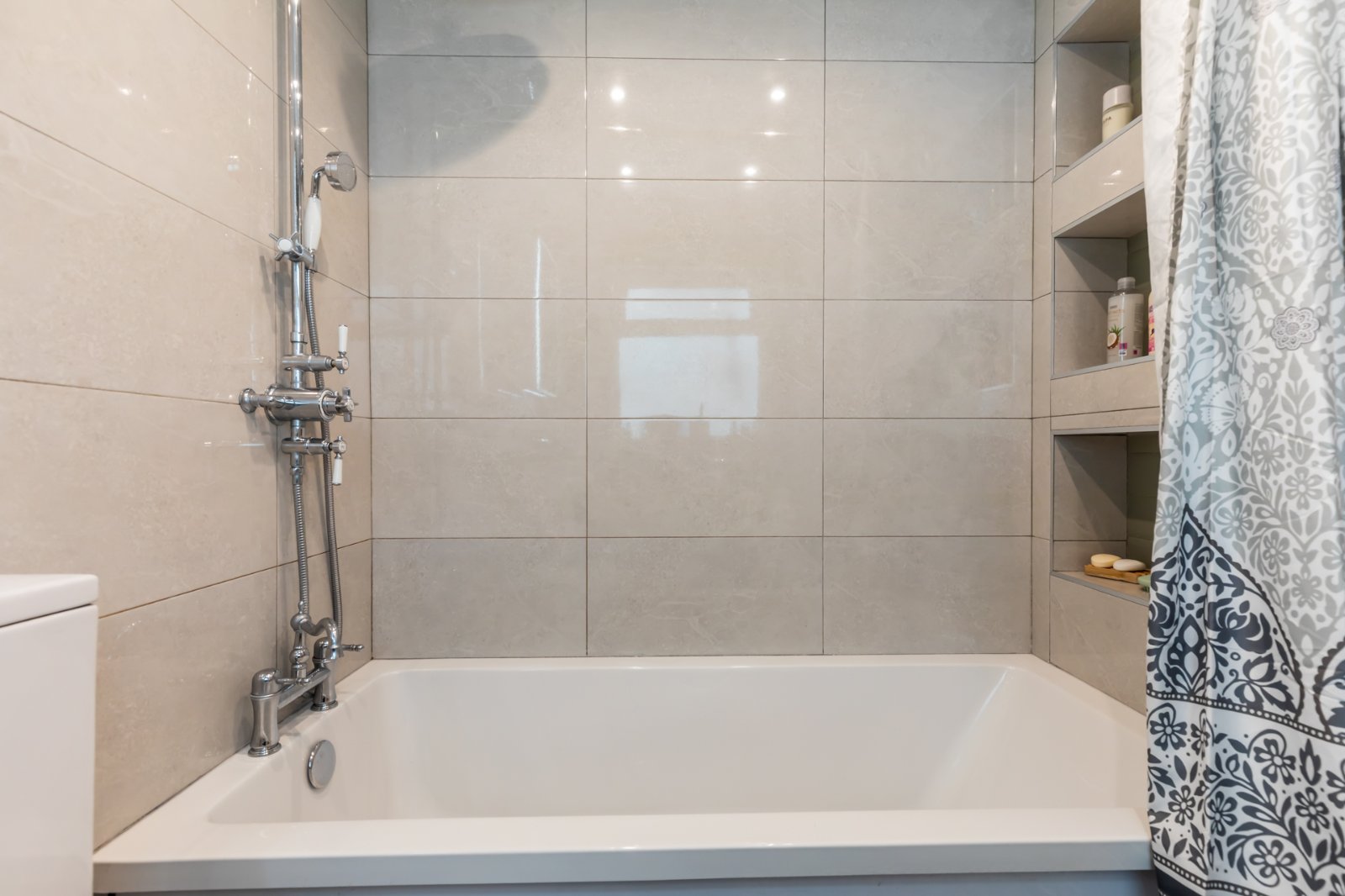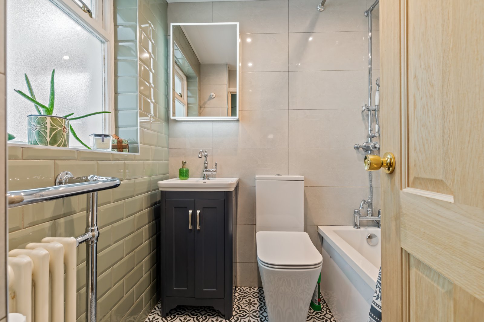 Low flush WC, pedestal wash hand basin with vanity unit, radiator, bath with shower above and underfloor heating