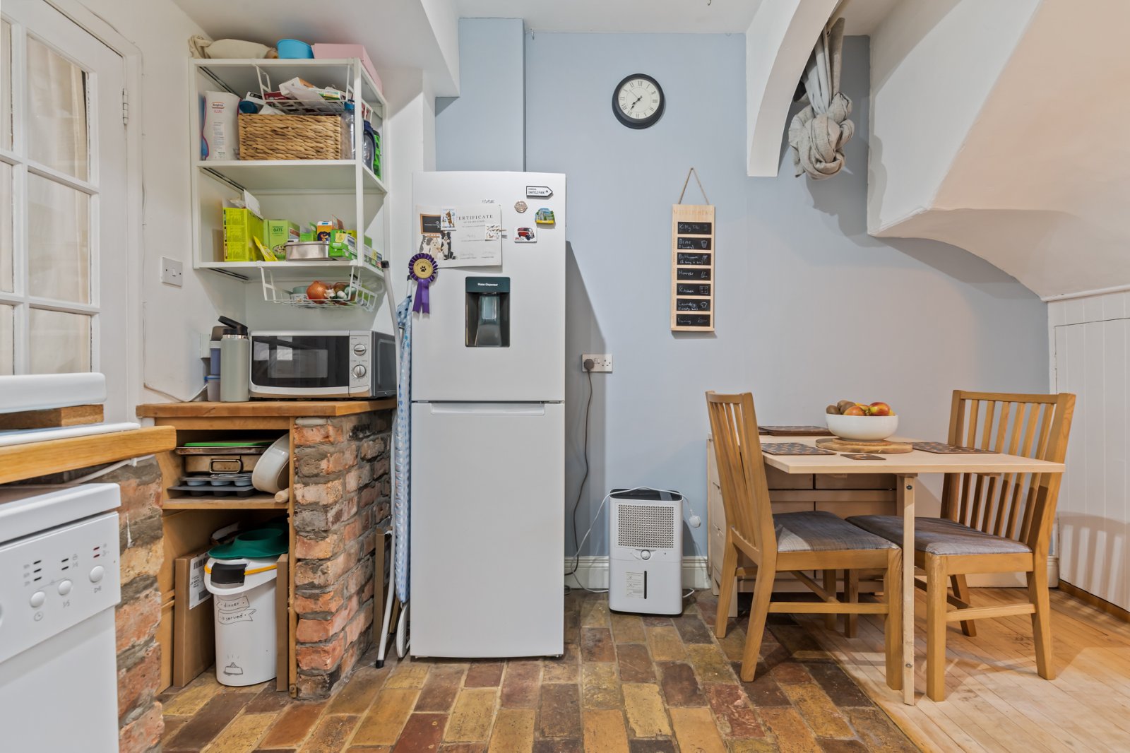 Stone floor, range of high and low level units, under bench electric oven, 5 ring gas hob, part tiled walls, extractor fan, ceramic sink, plumbed for dishwasher, space for fridge freezer