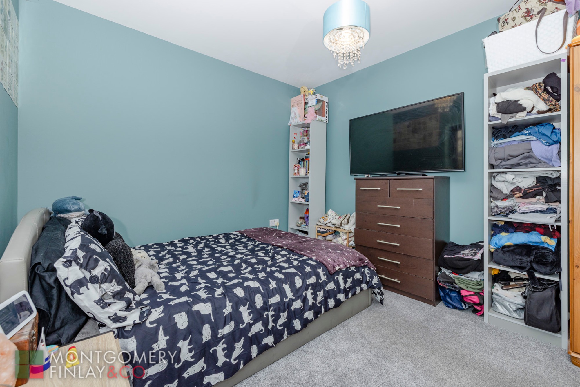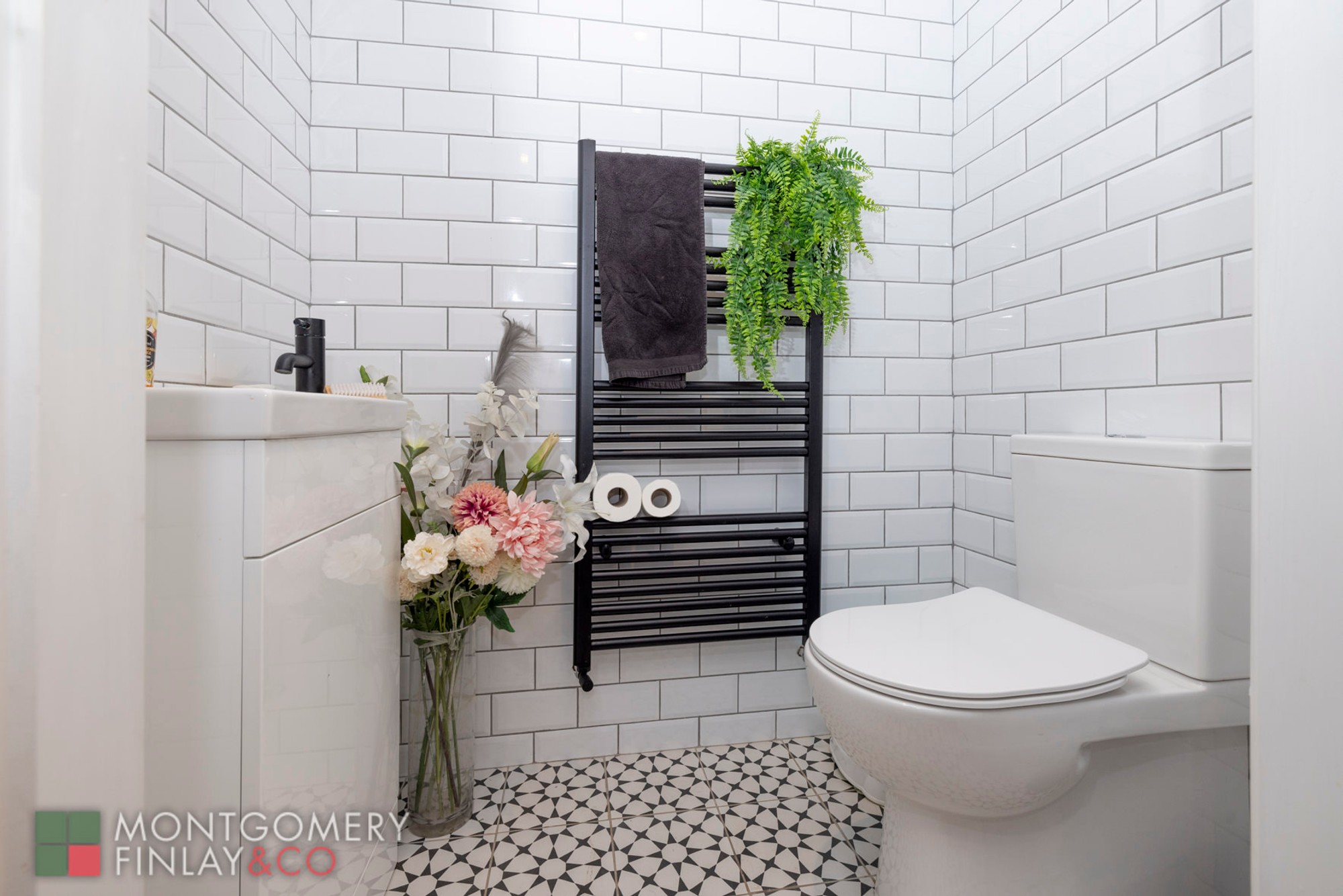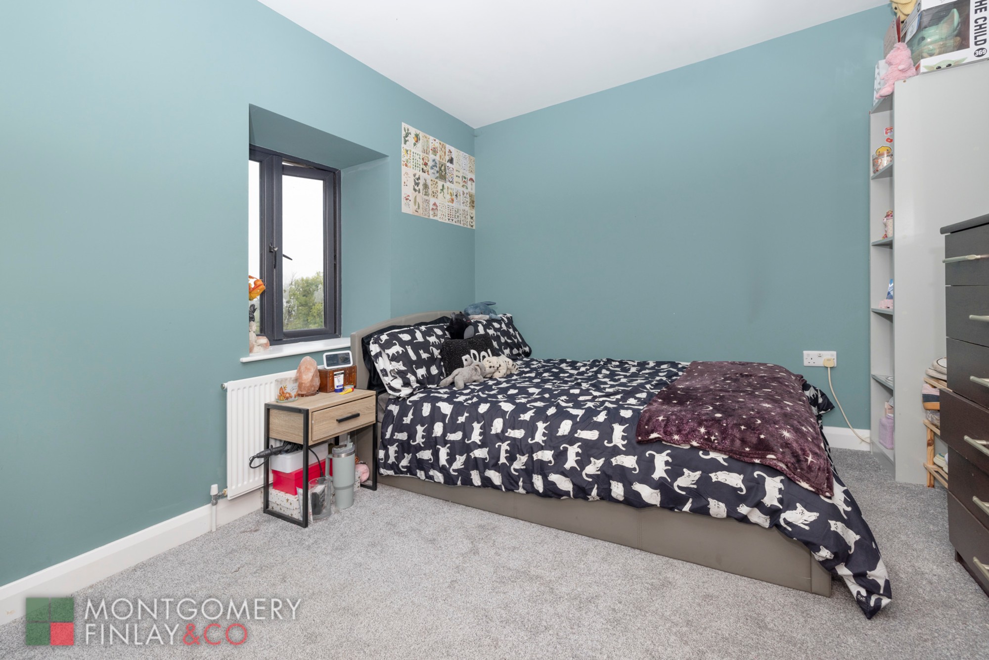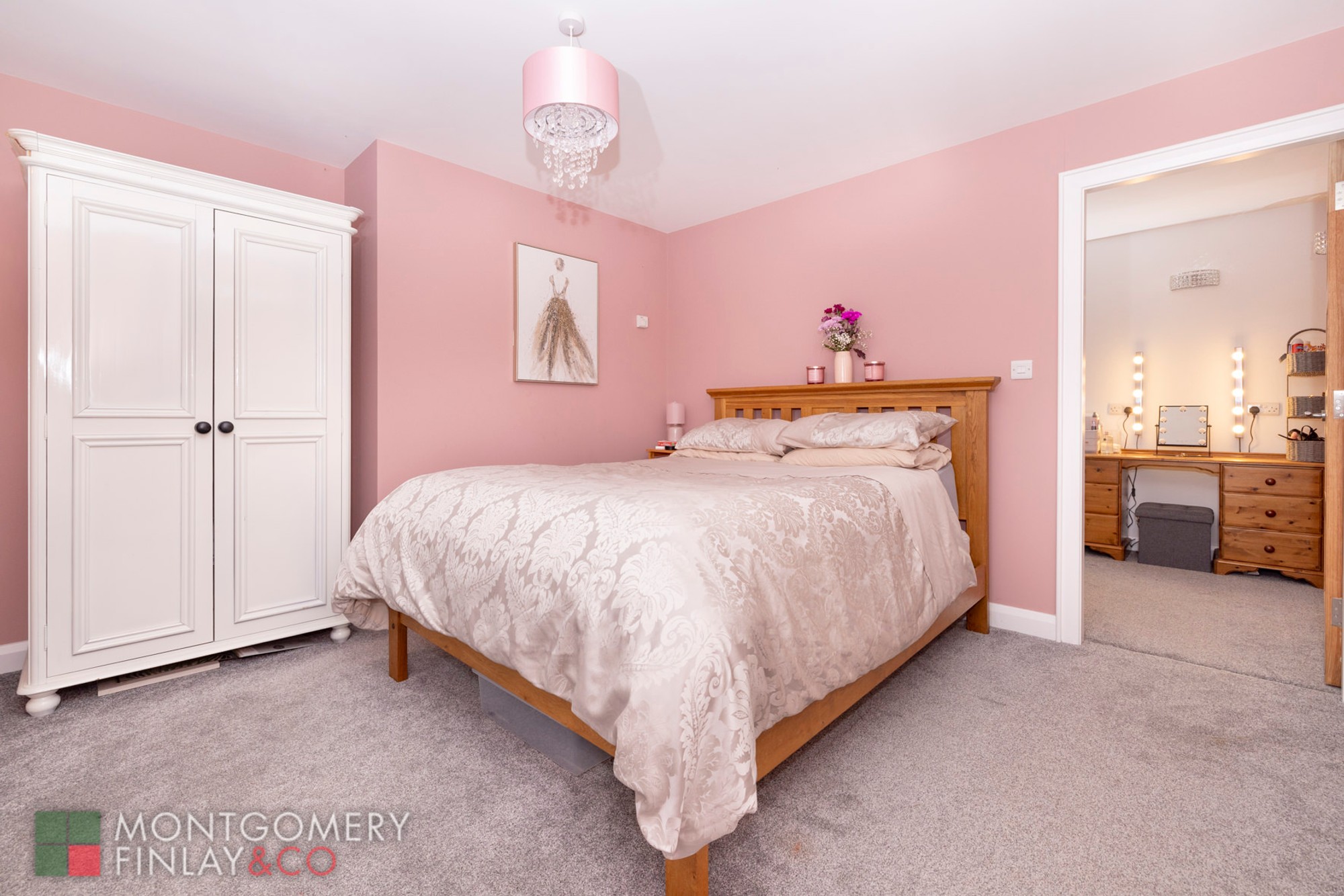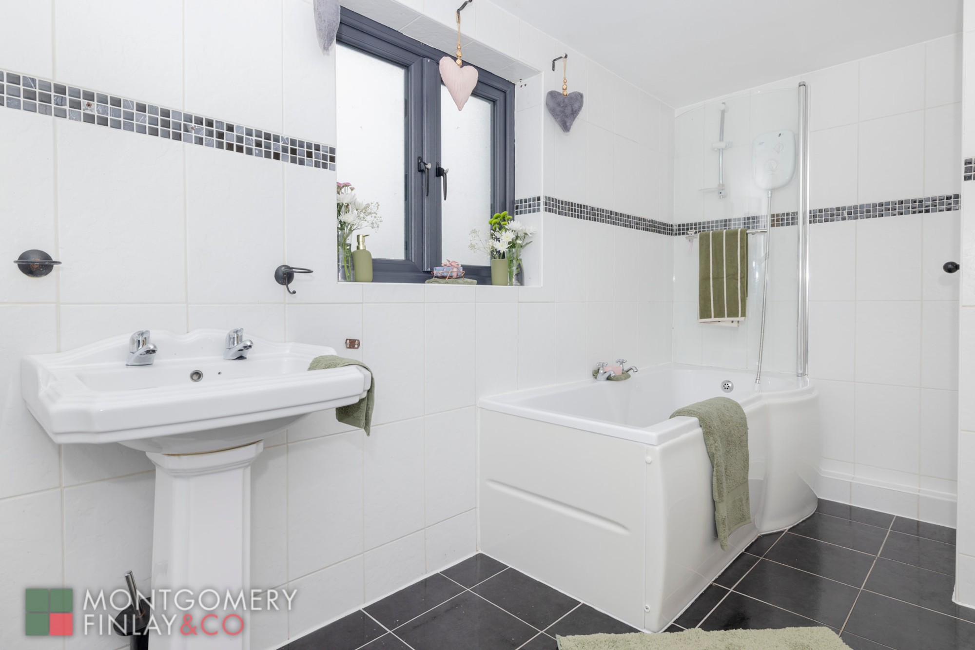 Three well-proportioned bedrooms, including a principal bedroom with walk-in wardrobe, provide excellent family accommodation, while the modern bathroom boasts elegant tiling and a bath with overhead electric shower.