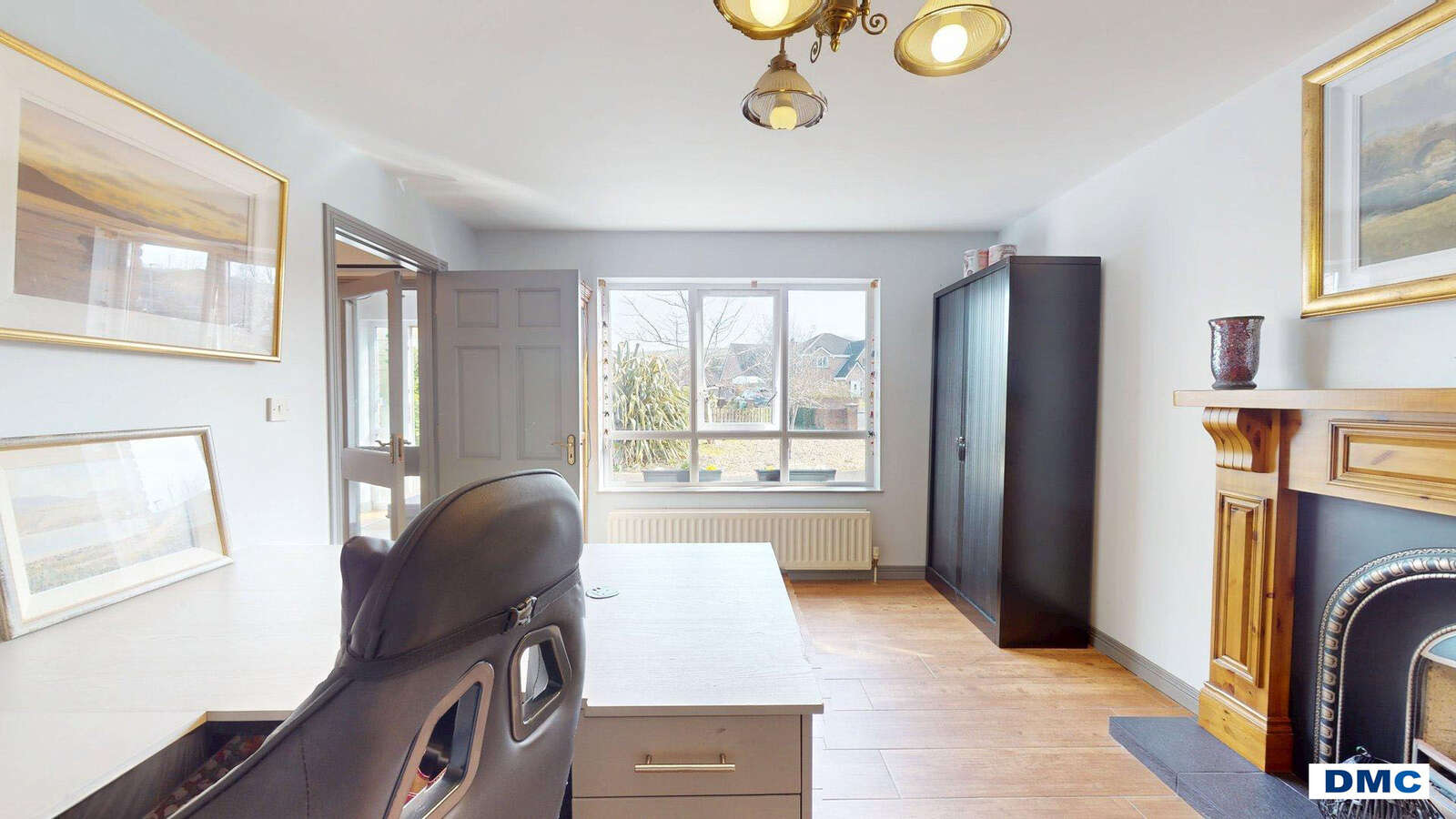 16'8 x 11'8 Feature cast iron horseshoe fireplace with open fire piped for gas effect fire, slate tiled hearth and redwood surround. Wood effect tiled floor. Excellent range of Contemporary built in office furniture including workstation, storage cupboards, drawer packs and open shelving.