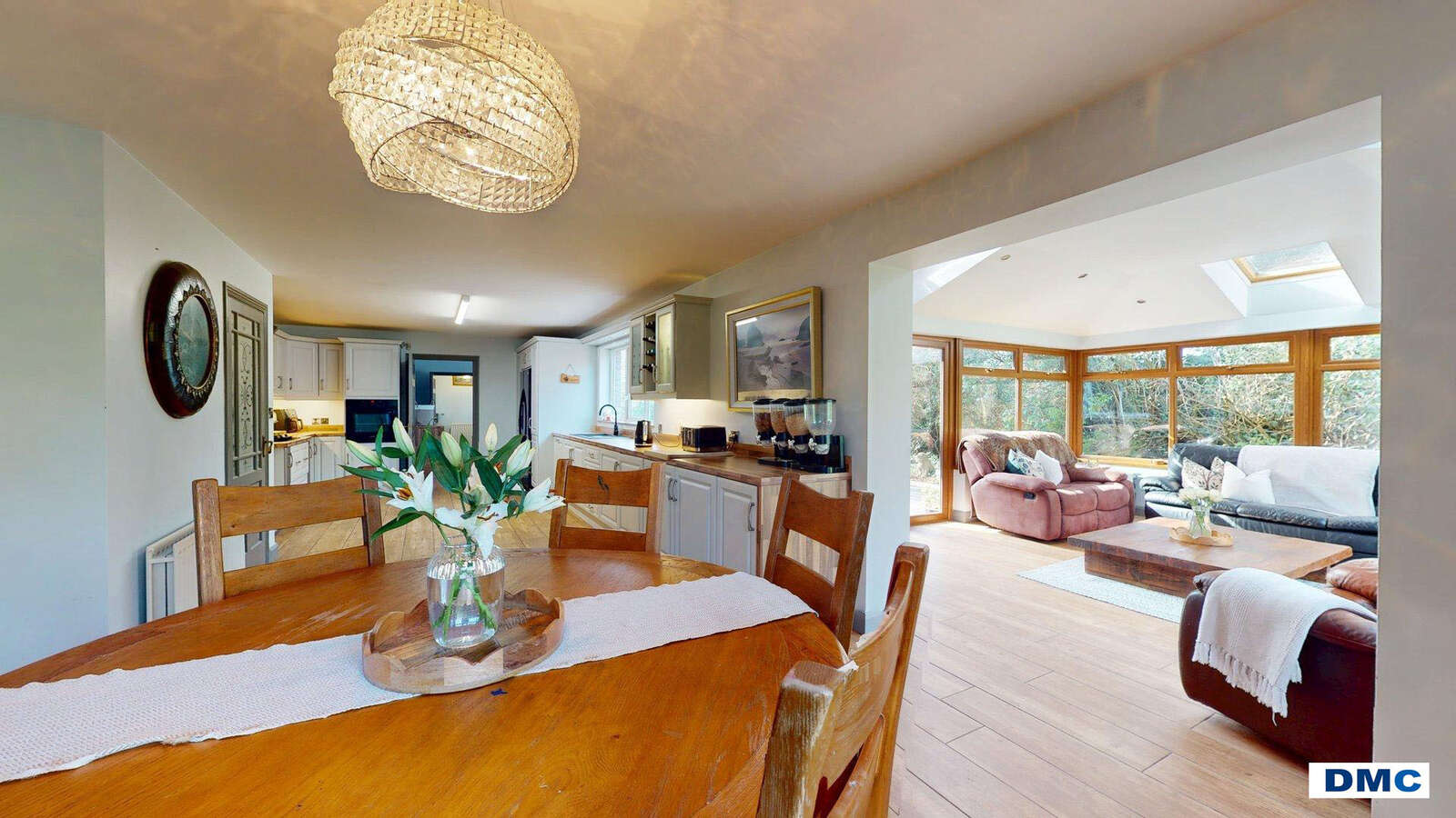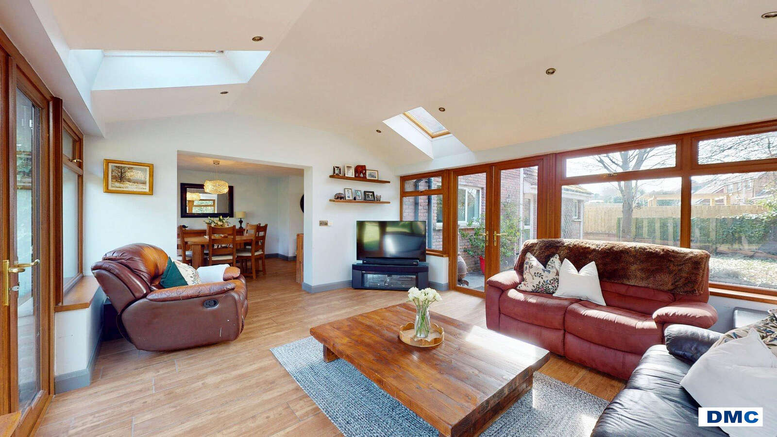 16'8 x 13'4 Feature vaulted ceiling with sky lights and recessed lights. Wood effect tiled floor. uPVC twin set of patio doors leading out into rear garden and patio area.