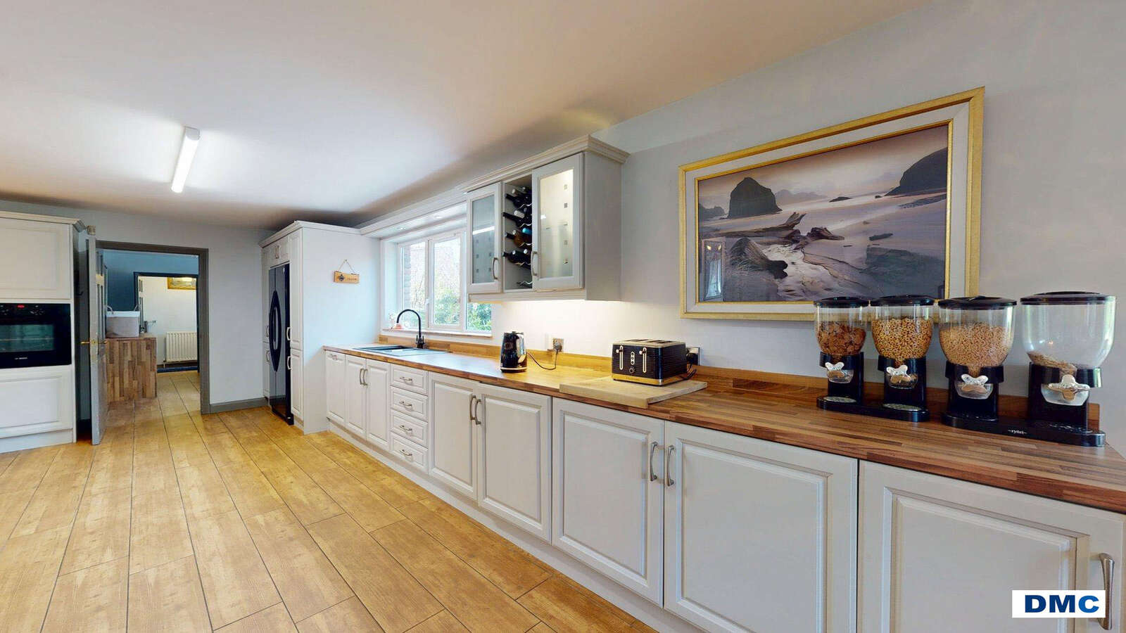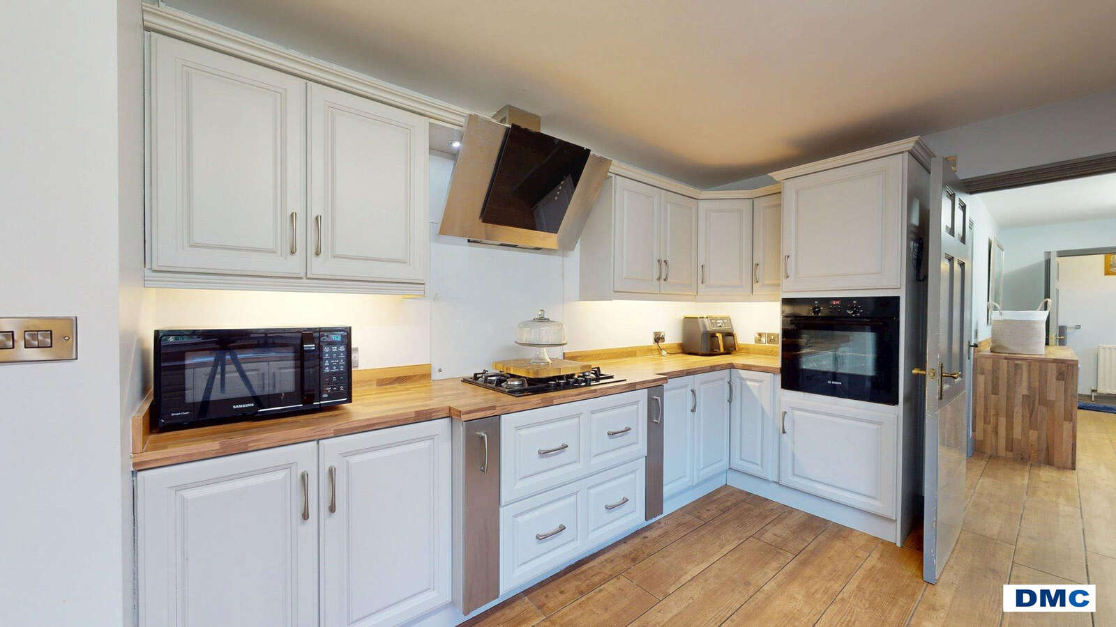 32'10 x 13'2 Excellent range of Contemporary Shaker style units with beech worktops and splashbacks. Ceramic one and quarter bowl sink unit and drainer with mixer taps. Wood effect tiled floor. Display units, winerack and window pelmet. Display lights to wall units. FLAVEL integrated dishwasher. DAEWOO American style fridge/freezer. BOSCH eyelevel electric oven and matching 5 ring gas hob.
