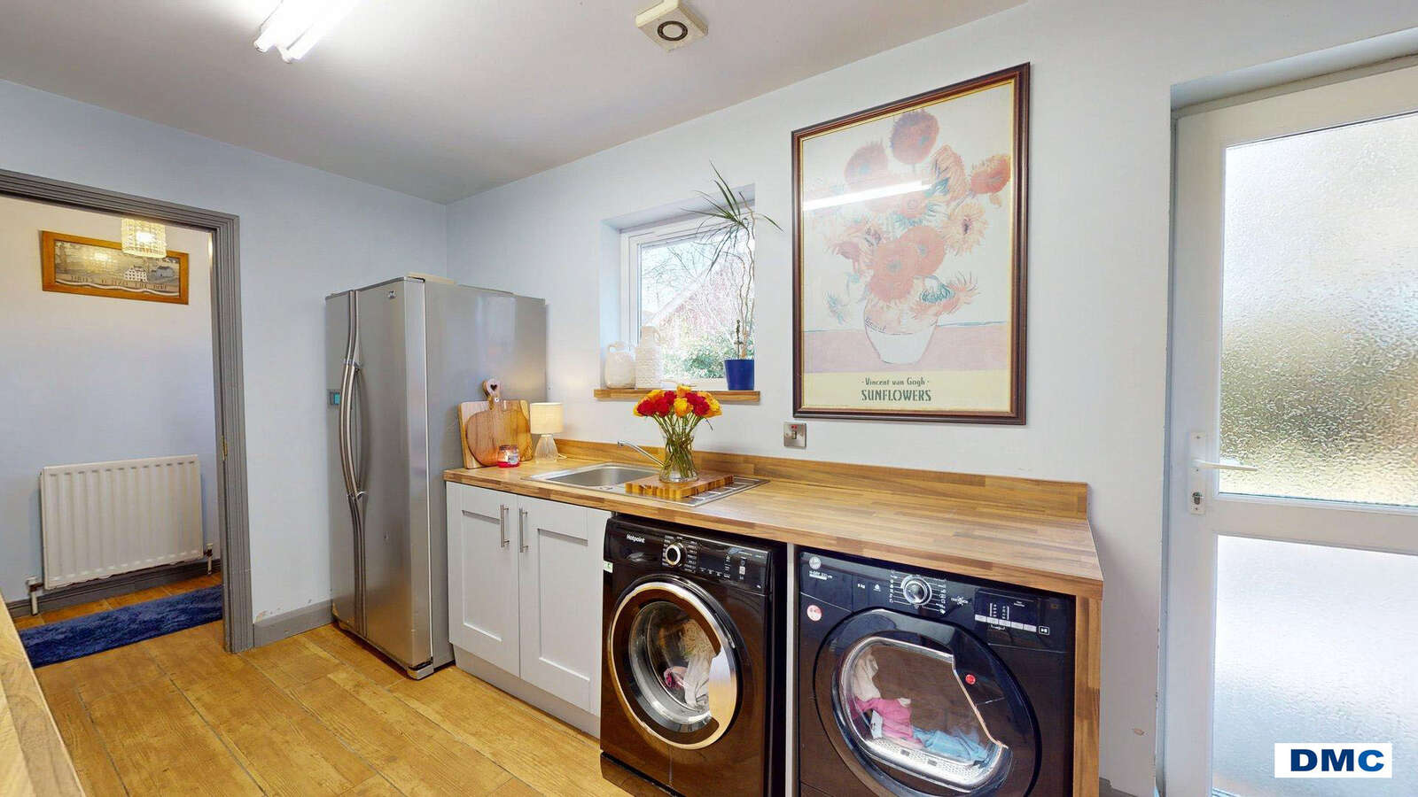 14'8 x 7'8 Good range of Contemporary Shaker style units with beech worktops and splashbacks. Stainless steel sink unit and single drainer with chrome mixer taps. Wood effect tiled floor. Plumbed for washing machine. Ducted for tumble dryer. uPVC rear door with double glazed centre lights.