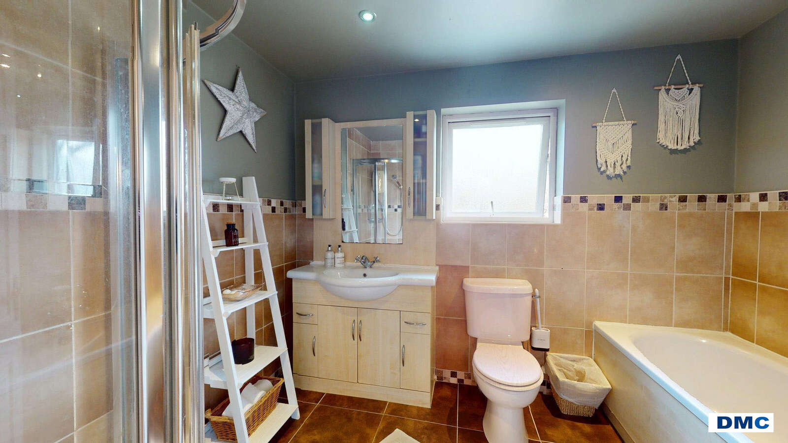 9'8 x 7'8 White, modern 4 piece suite comprising large bath with central mixer taps and shower attachment. Vanity unit with wash hand basin. Low flush w.c. Large corner shower unit with MIRA SPORT Electric shower. Feature tiling to walls and floor. Recessed lights to ceiling.