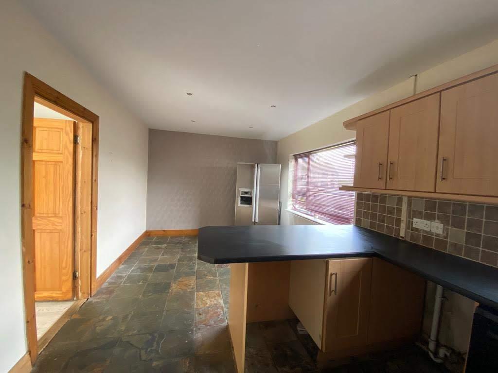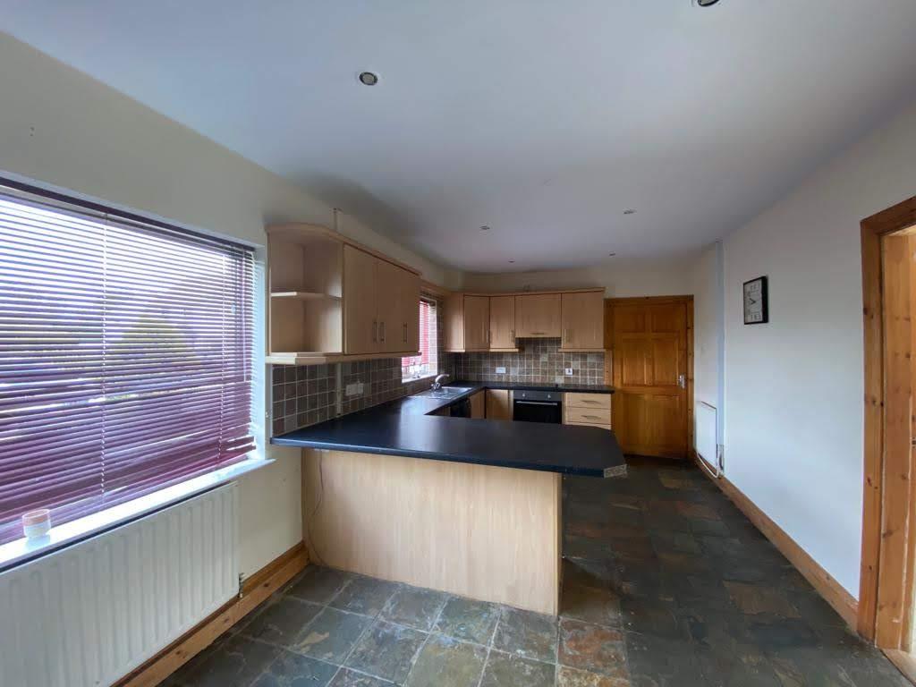 Having eye and low level units, tiling between units, single drainer stainless steel sink unit with mixer taps, plumbed for washing machine and dishwasher, ample dining space, recessed ceiling lighting, tiled floor.