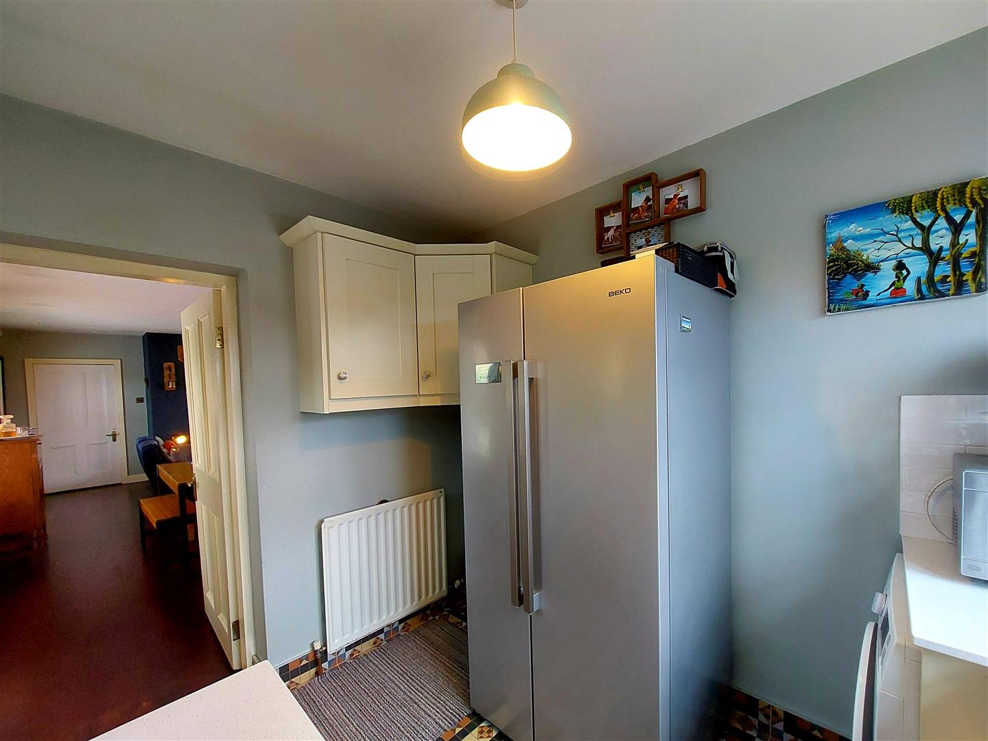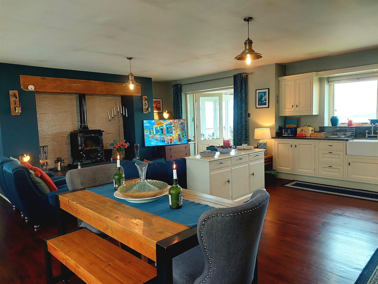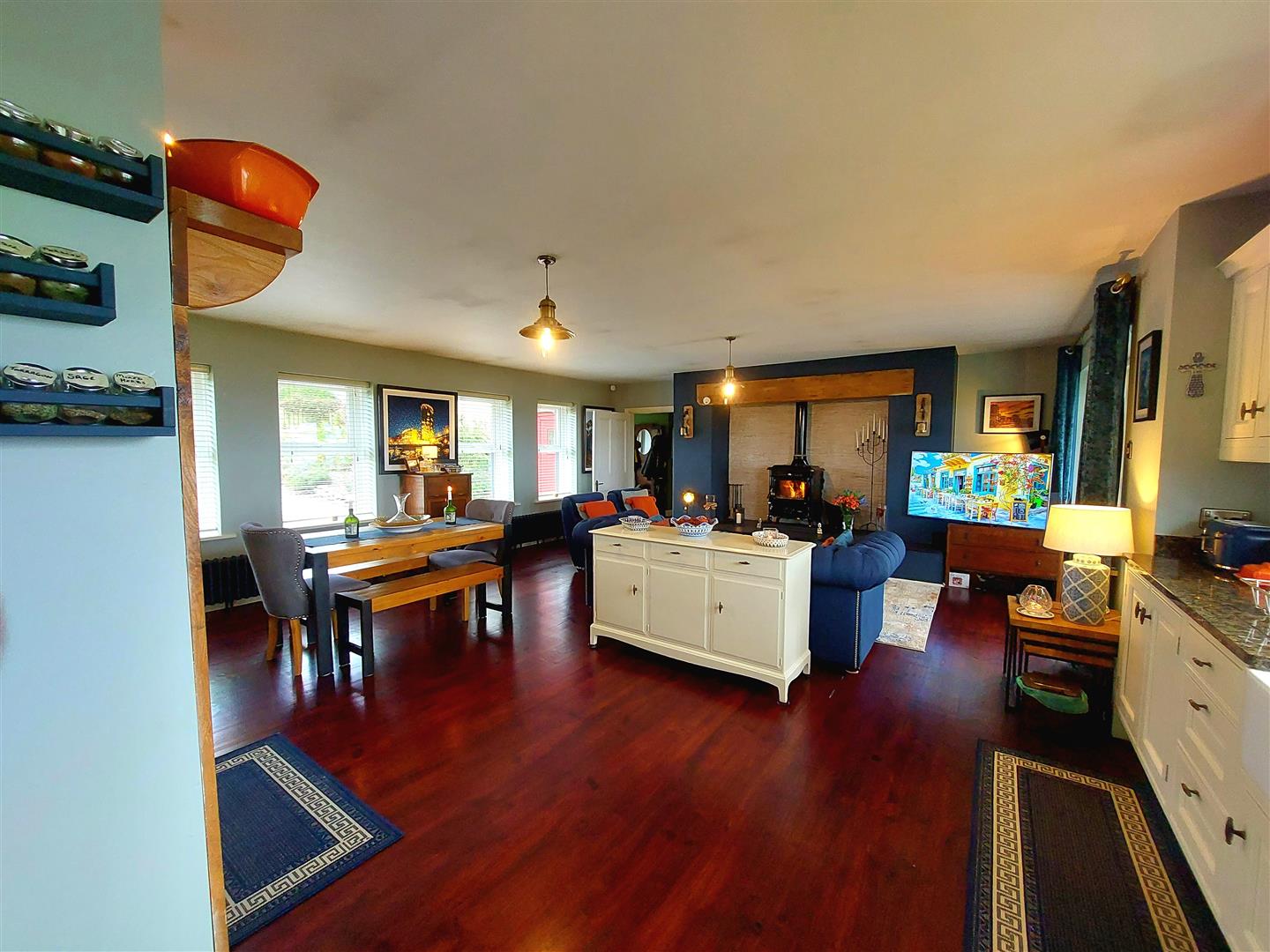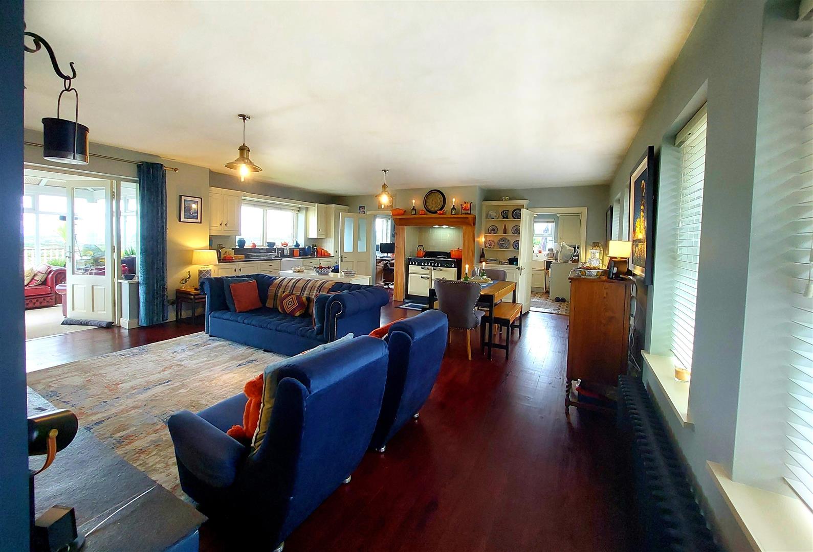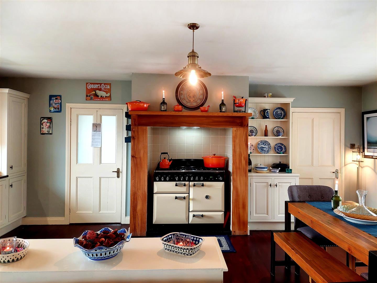Having excellent range of eye and low level units, matching pelmet over window with concealed lighting, 'Belfast' sink set in granite worktop, 'Rangemaster' cooking centre set in tiled canopy with wooden surround, 'Henley Blasket' multi fuel stove set on raised hearth with tiled surround, Oak feature beam, wooden floor, double doors leading to Conservatory.