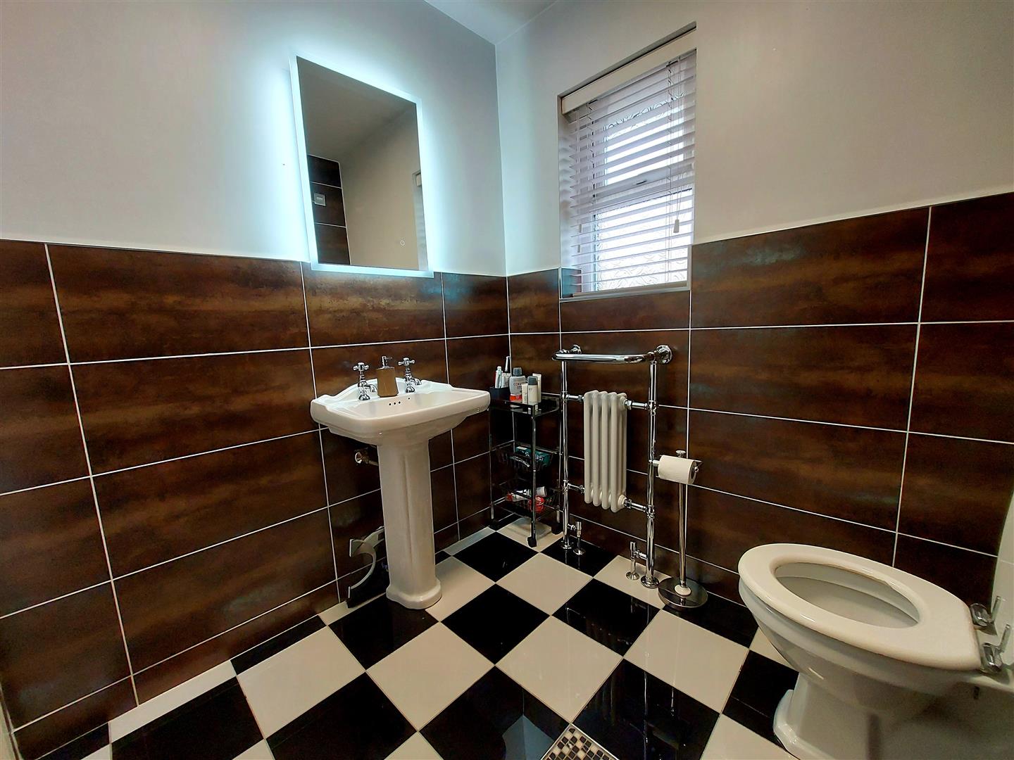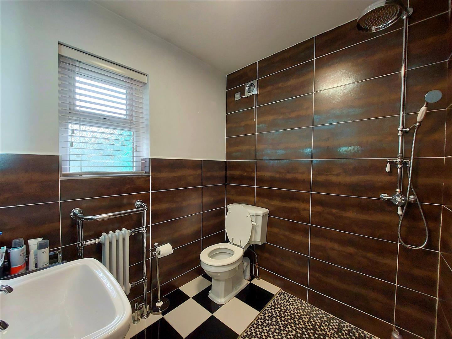 Comprising shower, whb and wc, chrome radiator, partly tiled walls, tiled floor.
