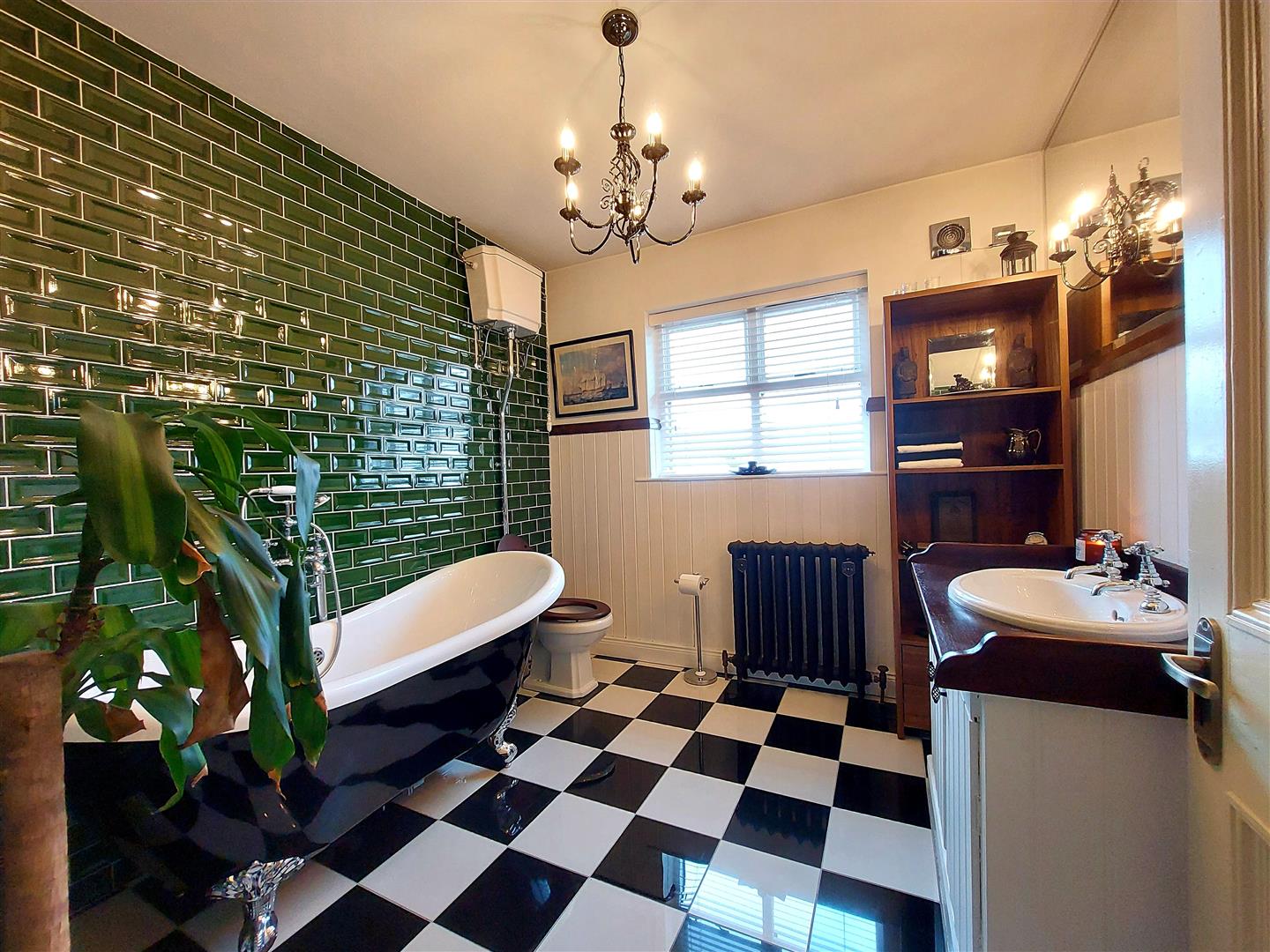 Comprising free standing bath with telephone hand shower attachment to taps, higher flush wc, whb set in vanity unit, two fully tiled walls, remaining walls panelled and mirrored with wall lights, tiled floor.