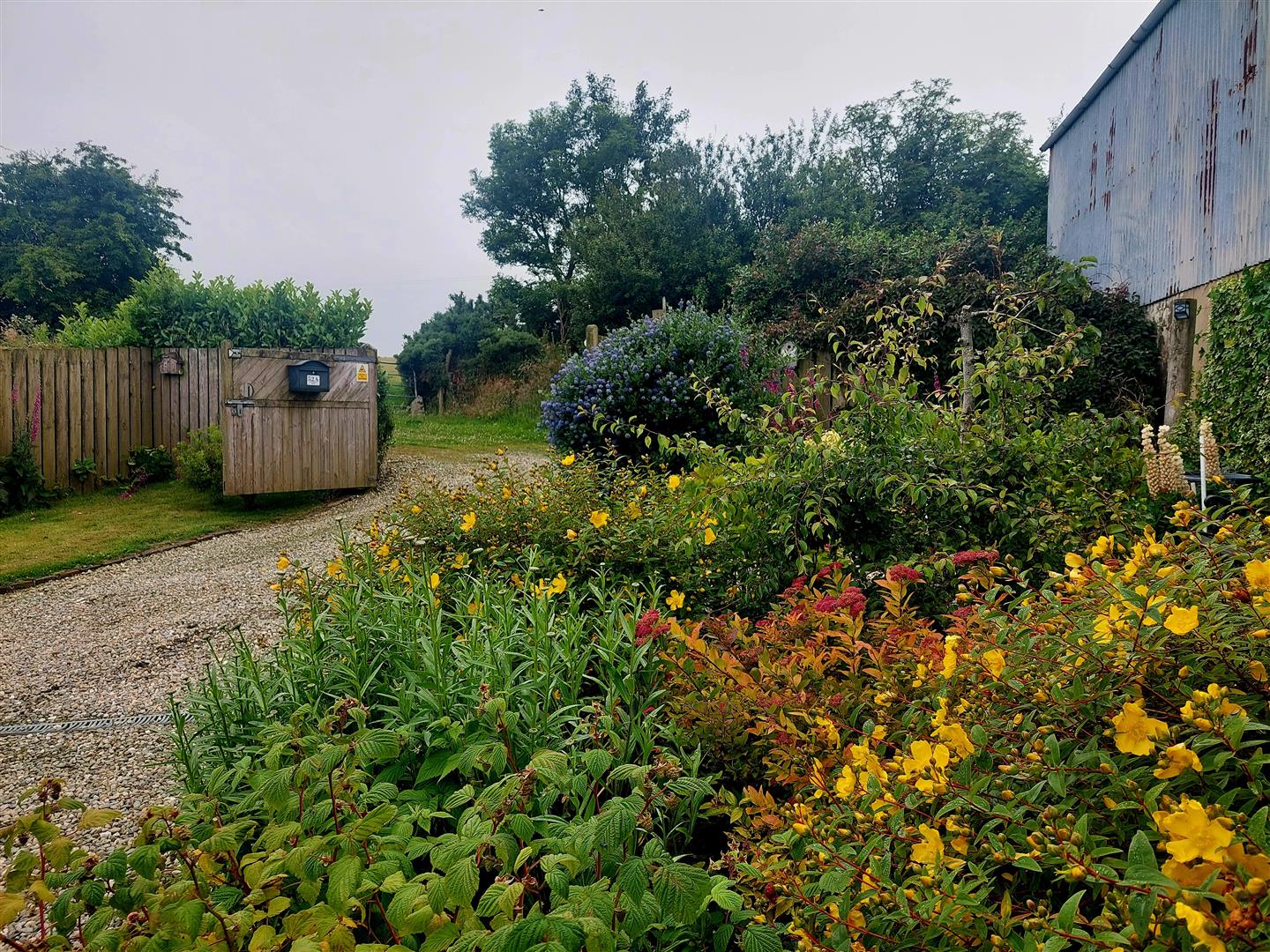 Neat lawns to front and rear stocked with fruit bushes and flowering shrubs.