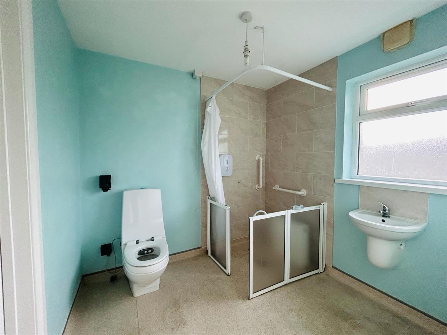 Comprising bath with telephone hand shower attachment to taps, whb set in vanity unit, wc, recessed lighting, partly tiled walls.