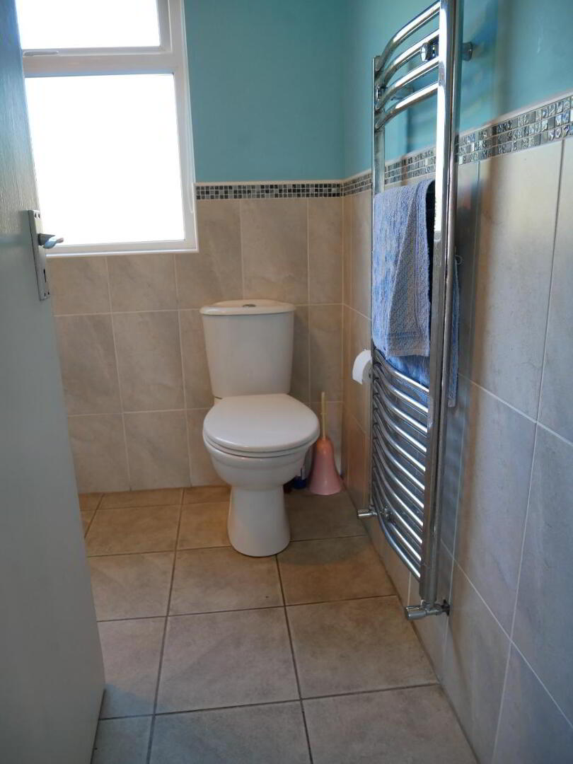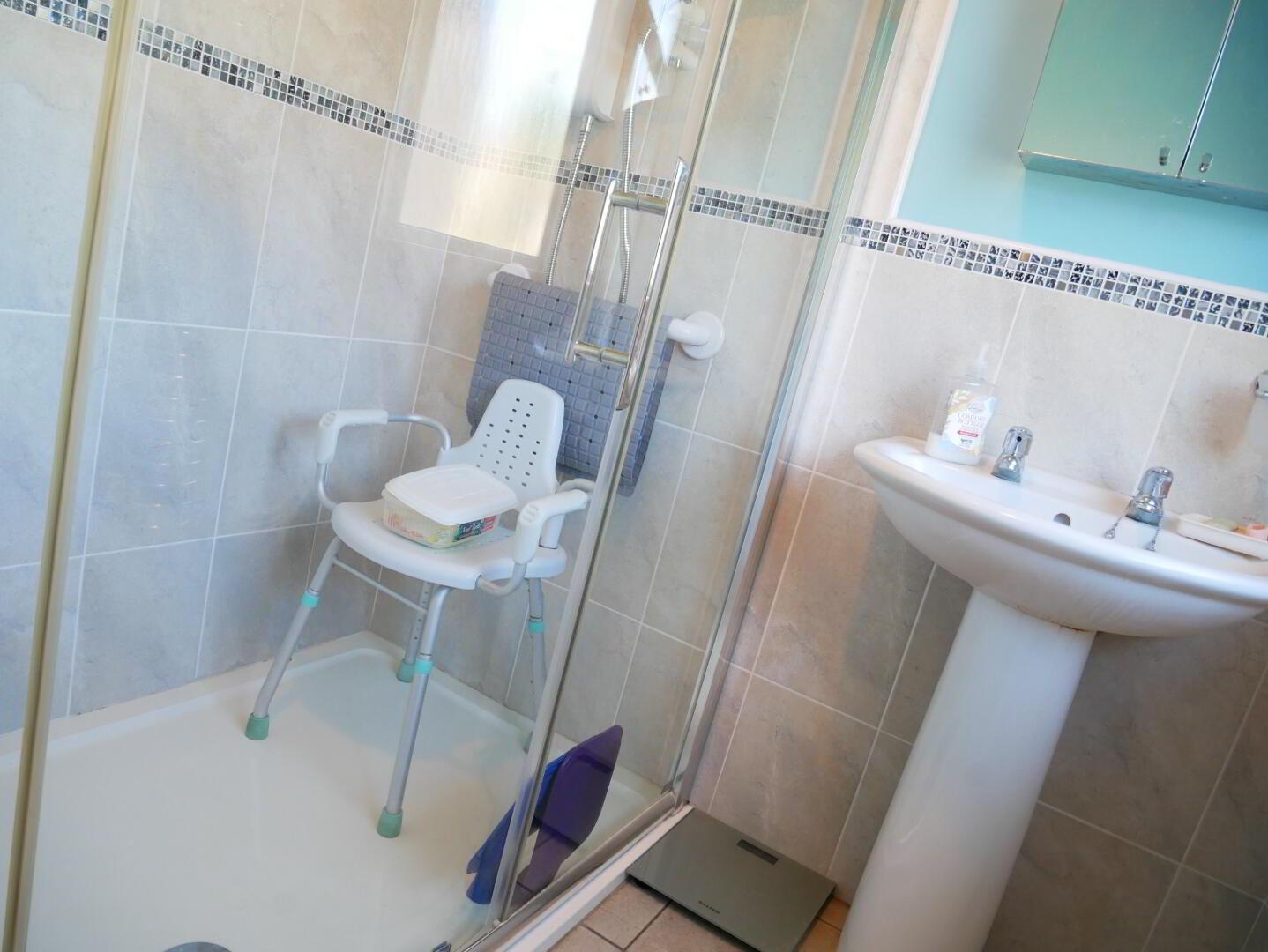 Shower Room: Oversize fully tiled walk in electric shower cubicle, wc, whb, half tiled walls, tiled floor, chrome heated towel rail.