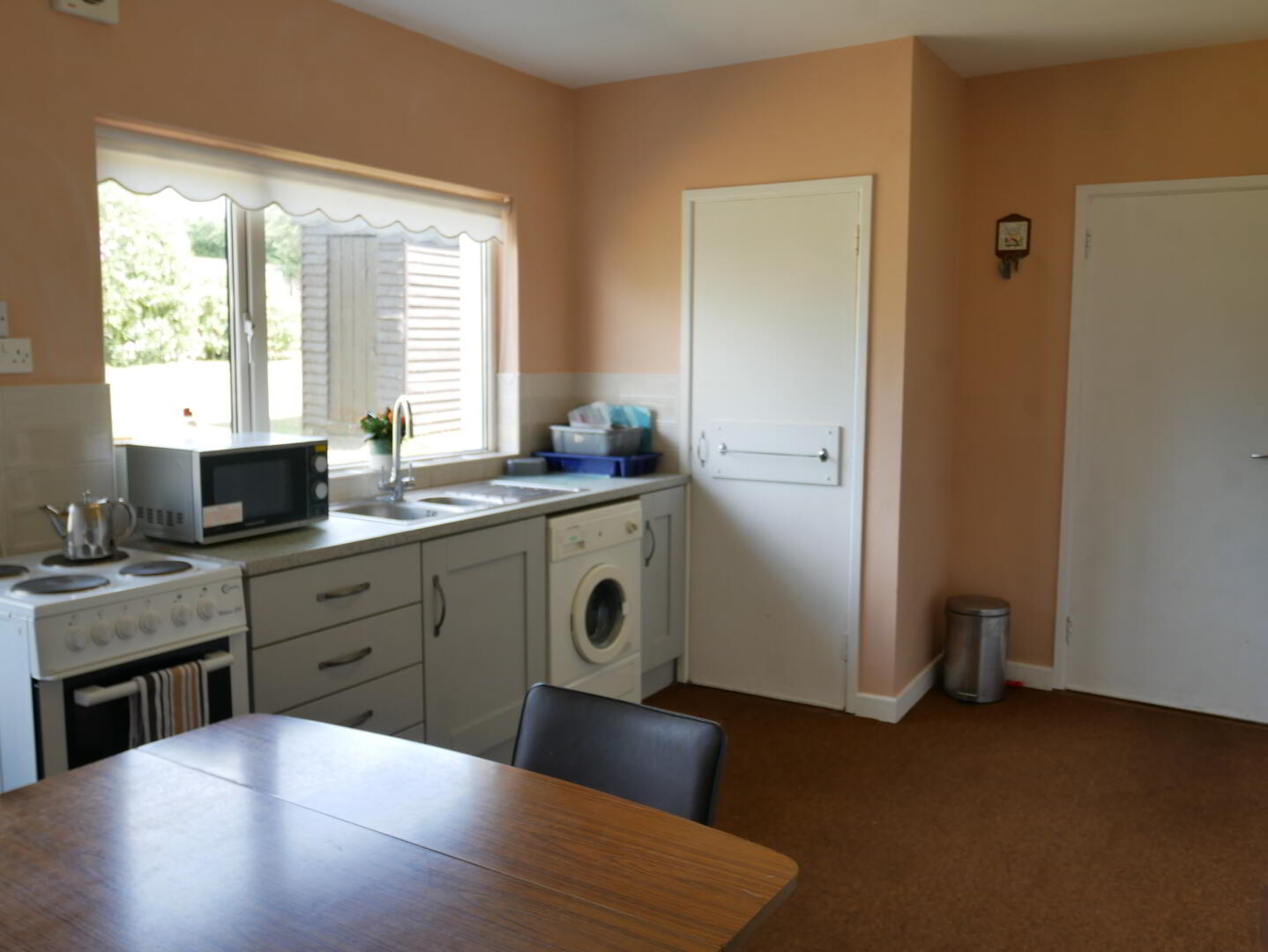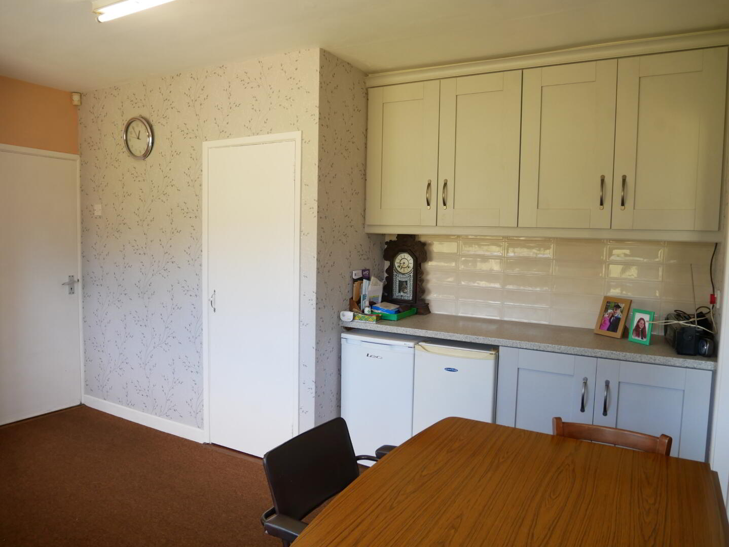 Kitchen: 14'3" x 12 (to widest points) Fitted with a range of eye and low level shaker style units, tiled around worktops, 1 1/2 bowl stainless steel sink unit, plumbed for washing machine, space for fridge and freezer, space for hob and oven, hotpress, storage cupboard with shelving.