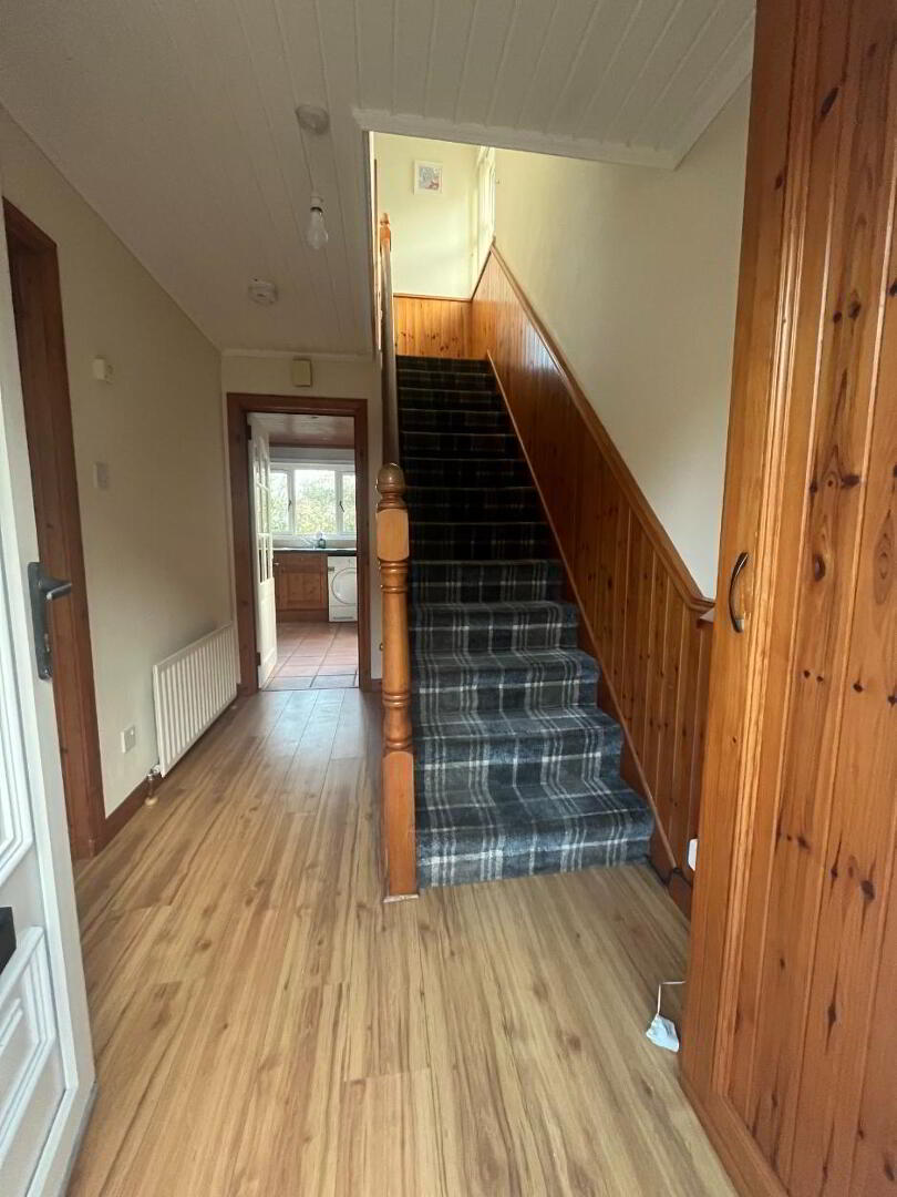 Entrance Hall:- PVC front door, laminate wood floor, under stairs cupboard (oil fired boiler).