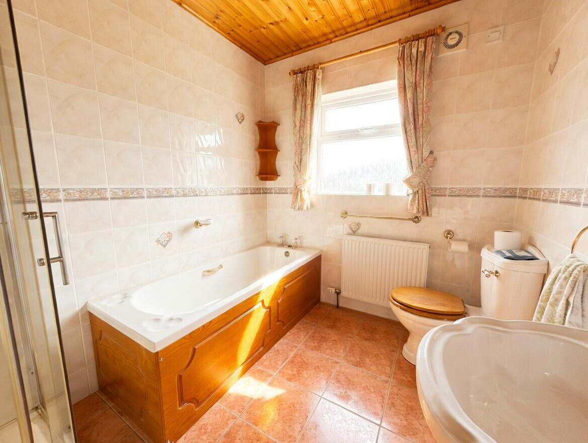 Bathroom – Fully tiled walk in electric shower cubicle, wood panelled bath, WC, wash hand basin, fully tiled walls, tiled floor, extractor fan, pine panelled ceiling.