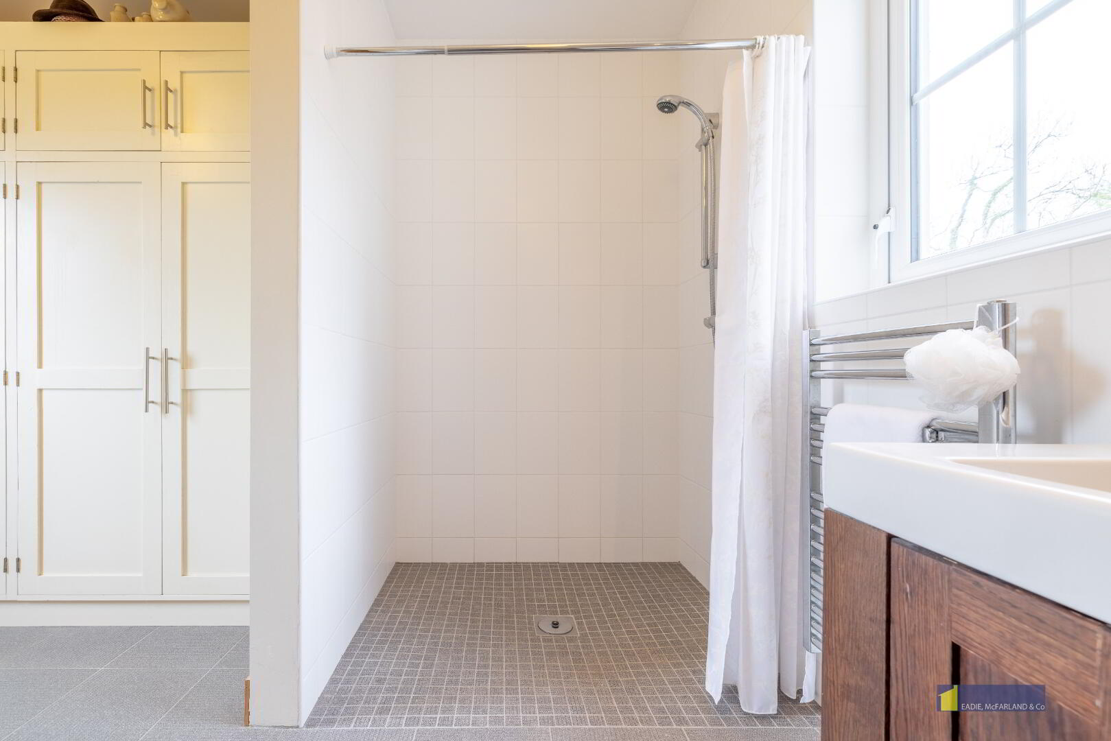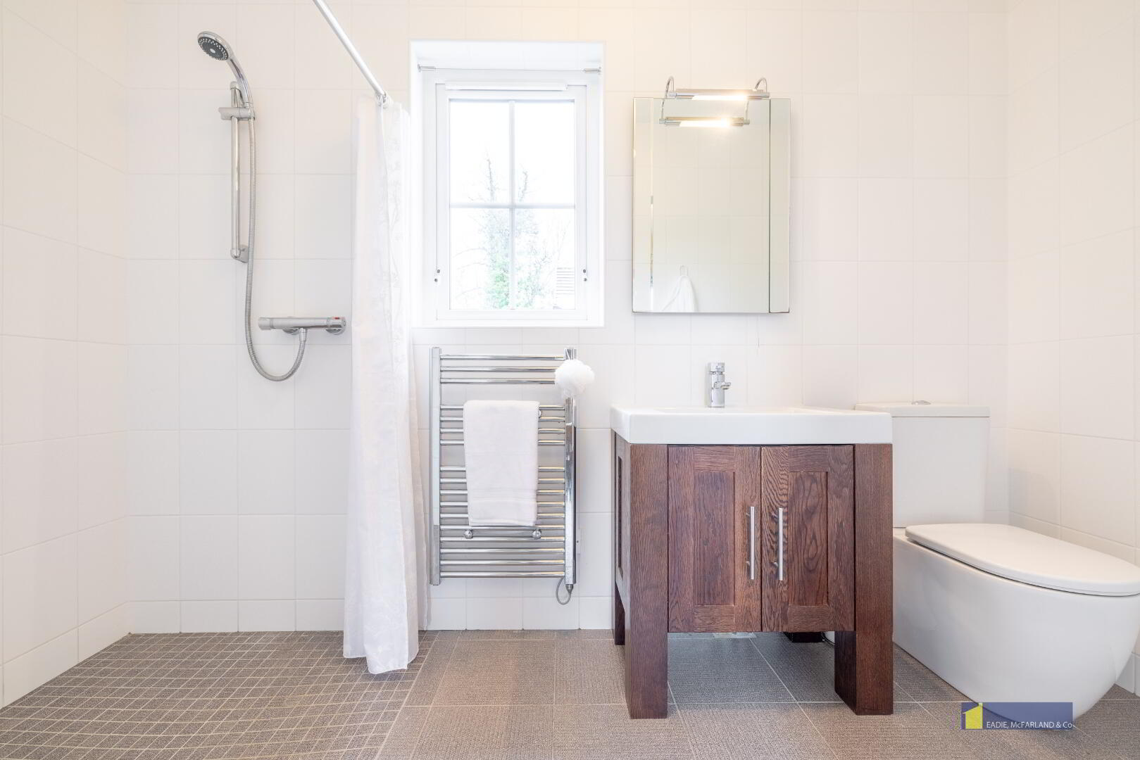 Ensuite: Fully tiled walk in mains shower with wetroom style floor, low flush wc, whb with vanity, fully tiled walls, tiled floor, chrome heated towel rail, extractor fan.