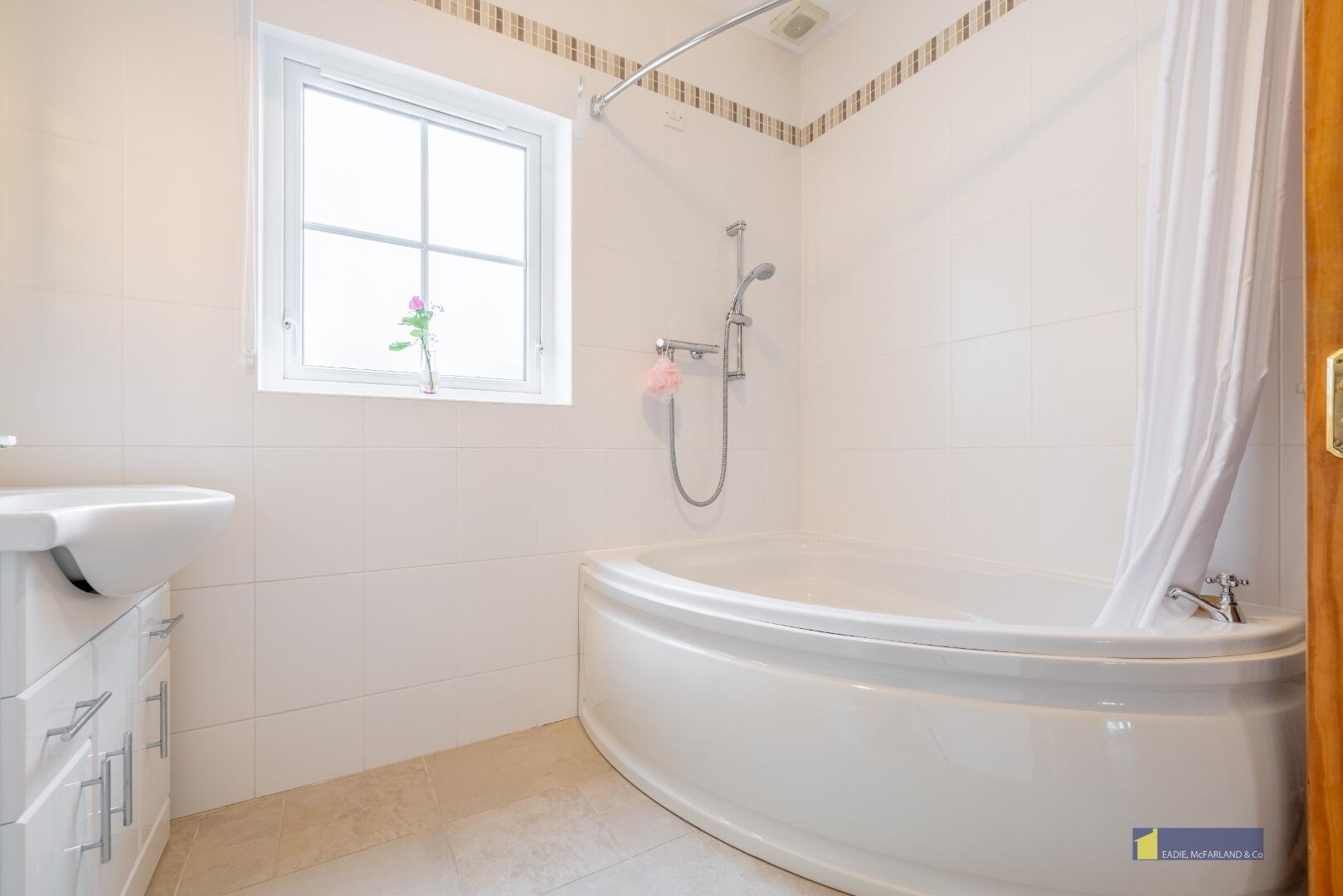 Bathroom: Corner bath with mains shower over, low flush wc, whb with vanity, fully tiled walls, mirror with integrated lighting.