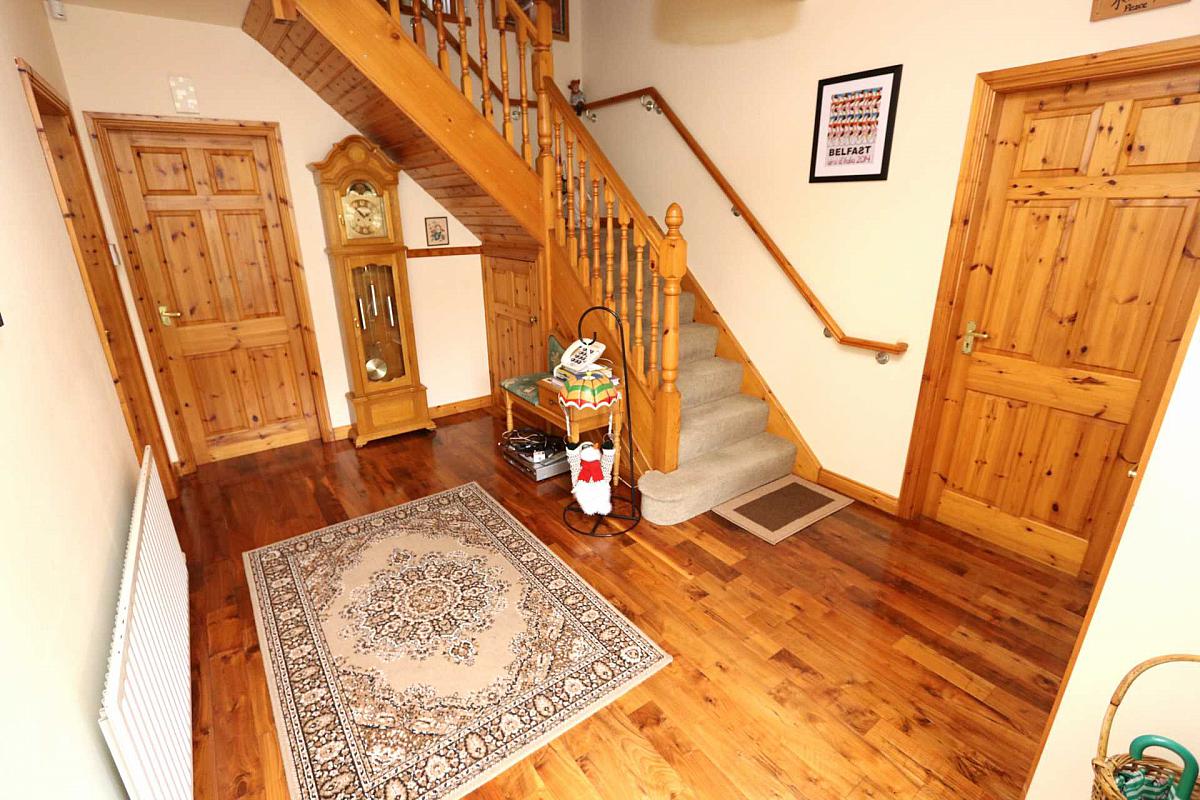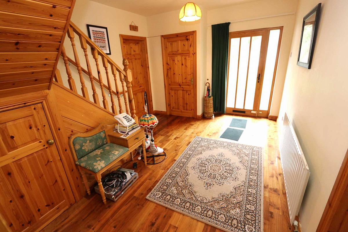 The property is accessed to the front from a sheltered porchway into a large entrance hall featuring hard wood flooring and under the stairs storage, the family living rooms is bright and spacious with a cosy open fire, the kitchen has a mix of high and low level cupboards featuring a breakfast bar. The dining room is flooded with natural light and conveniently situated right next to the kitchen featuring French Doors with access to the outside patio area. Furthermore on the ground floor just off the kitchen is a large utility room and walk-in storage cupboard/pantry. There is also a downstairs WC and fourth bedroom.