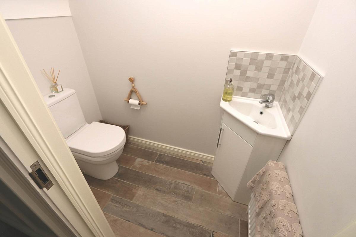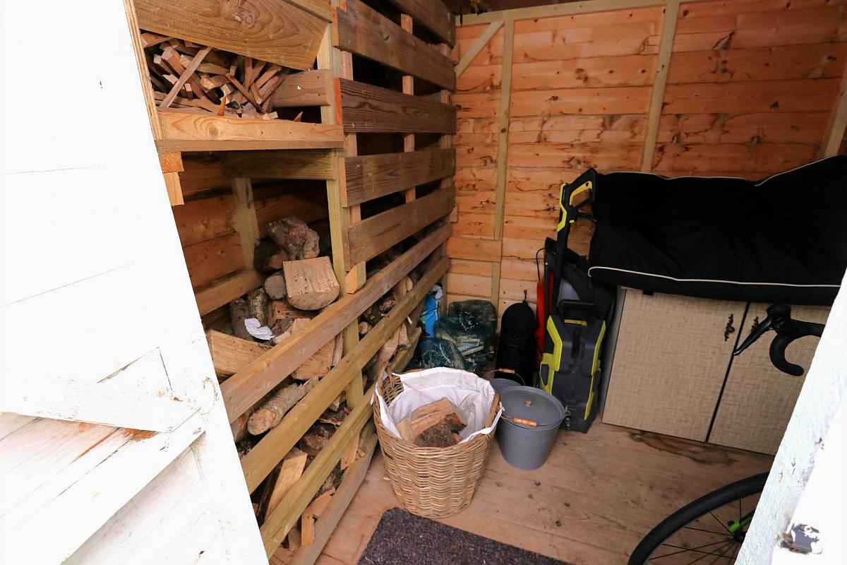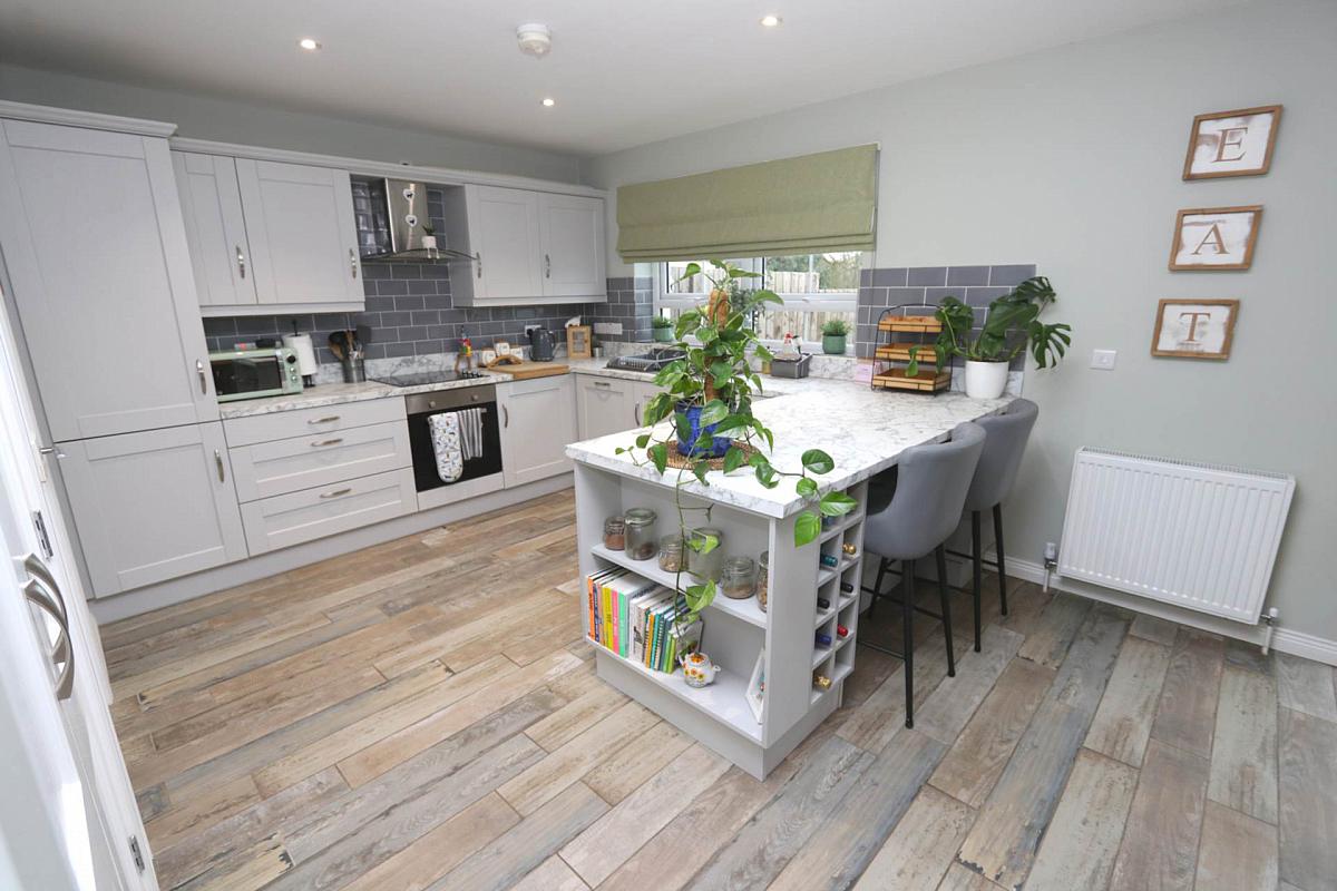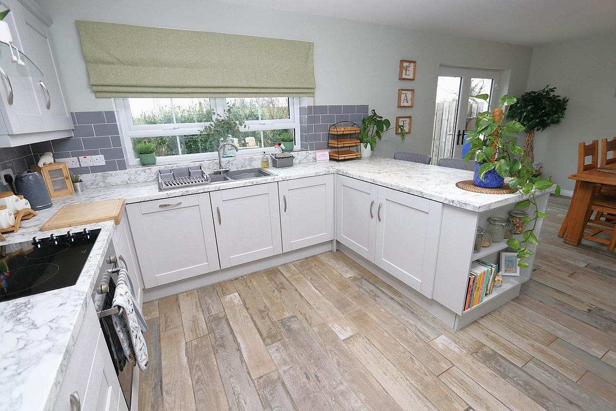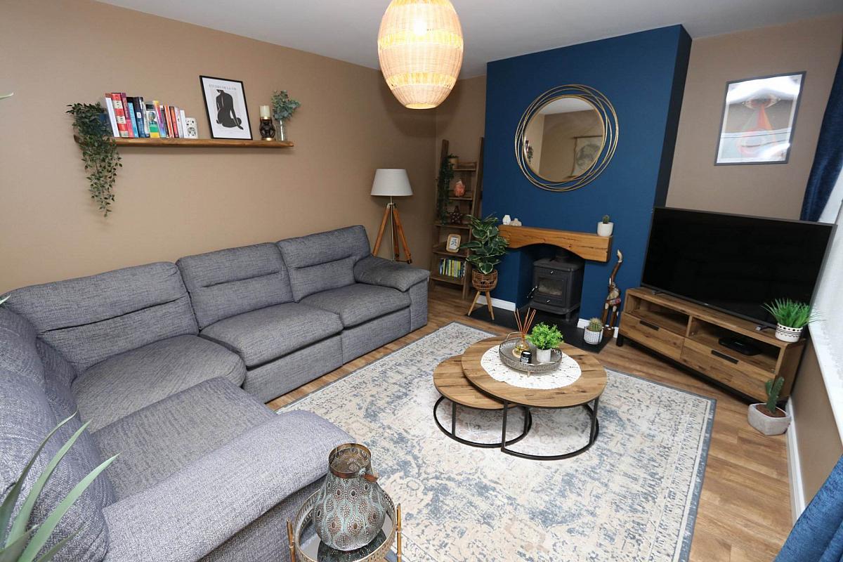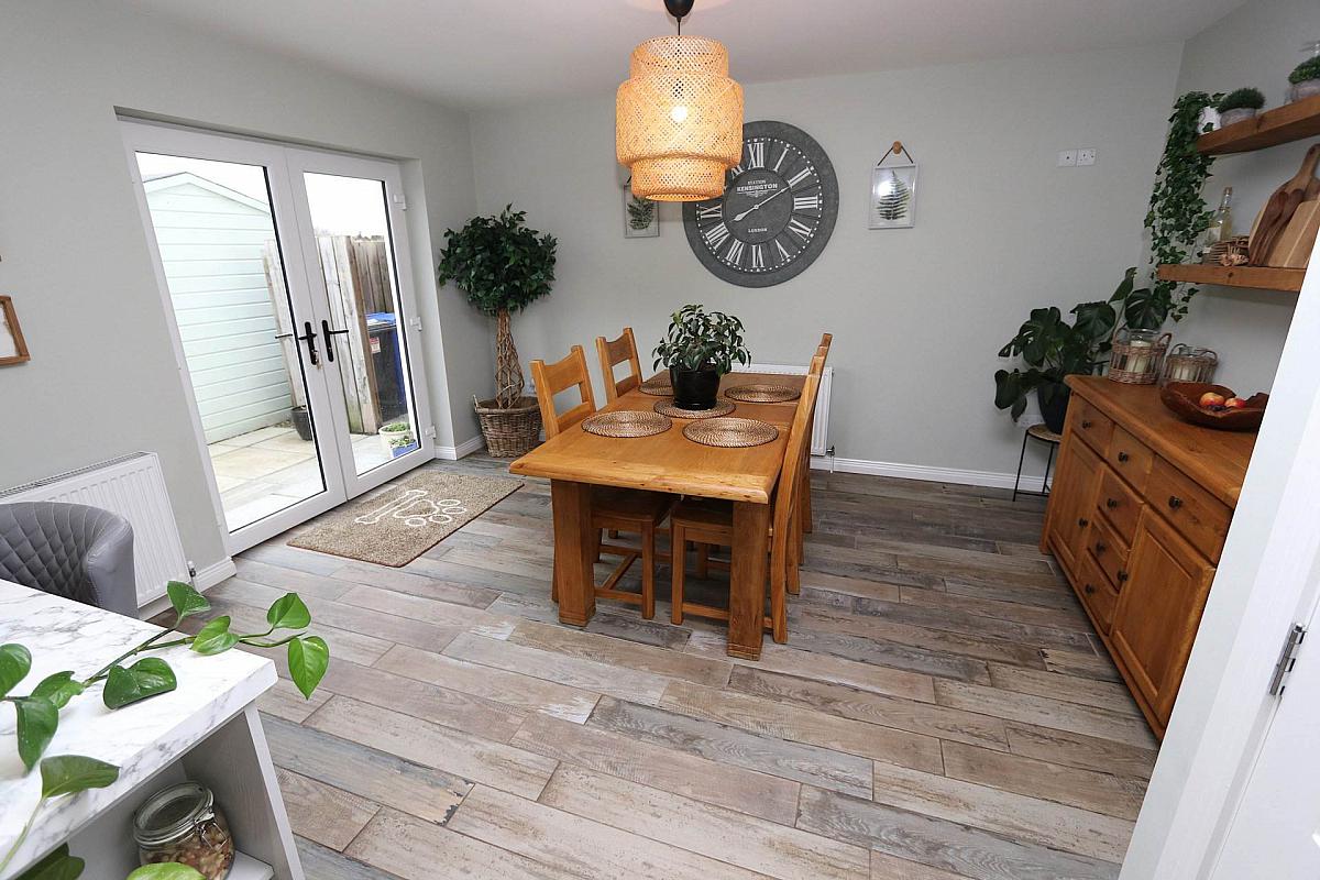 Step inside to a welcoming entrance hall leading to a cosy living room, complete with a charming wood-burning stove. The heart of the home is the bright and airy open-plan kitchen and dining area fully equipped with integrated appliances, a breakfast bar, and a standout feature: a double walk-in larder! French doors open onto an enclosed patio and garden, creating the perfect setting for entertaining. A convenient ground-floor WC completes the space.