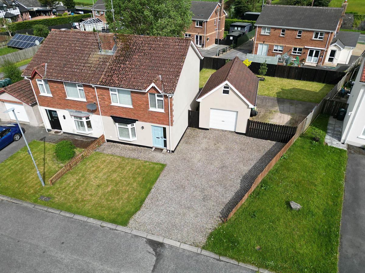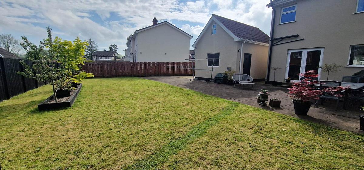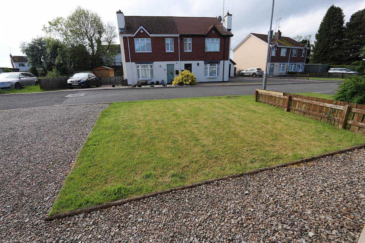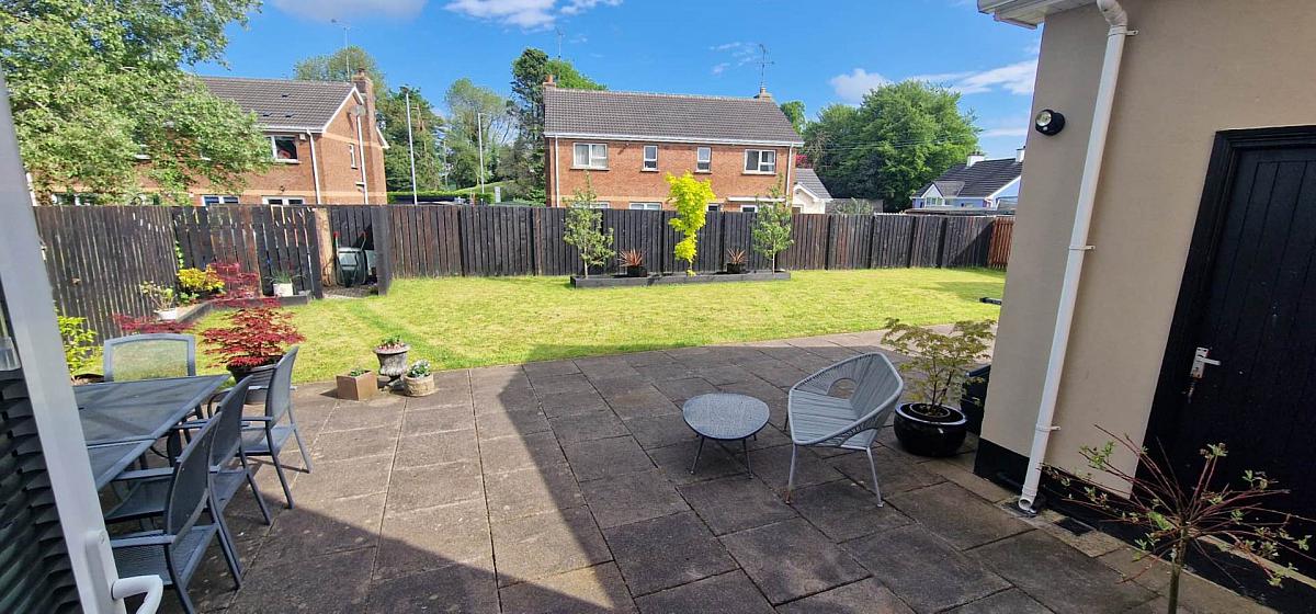 The property sits in a quiet development, with a stoned driveway providing ample parking for multiple vehicles and a small front lawn adds a touch of greenery. While a pedestrian gate grants access to the rear, here, a surprisingly expansive lawn and patio area extends the entertainment space and provides a secure environment. This arrangement also provides additional enclosed parking, ideal for accommodating a campervan or a boat. The large detached garage is outfitted with plumbing for a washing machine, a sink with hot/cold taps, a ground-floor radiator, a fully floored first floor, and a roller door for access.