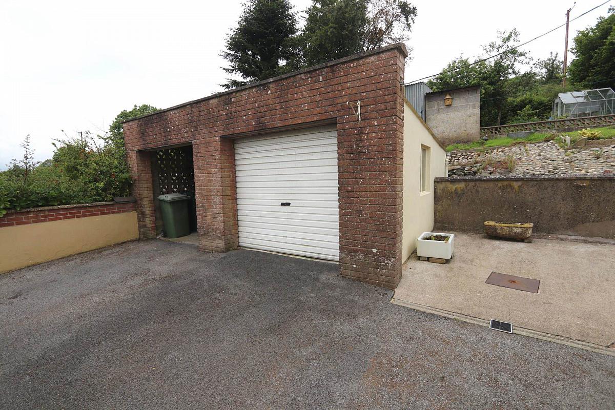 The outdoor area features a tarmac driveway with ample parking, a detached garage, a storage shed, a sheltered porch area, and an elevated garden with additional sheds.