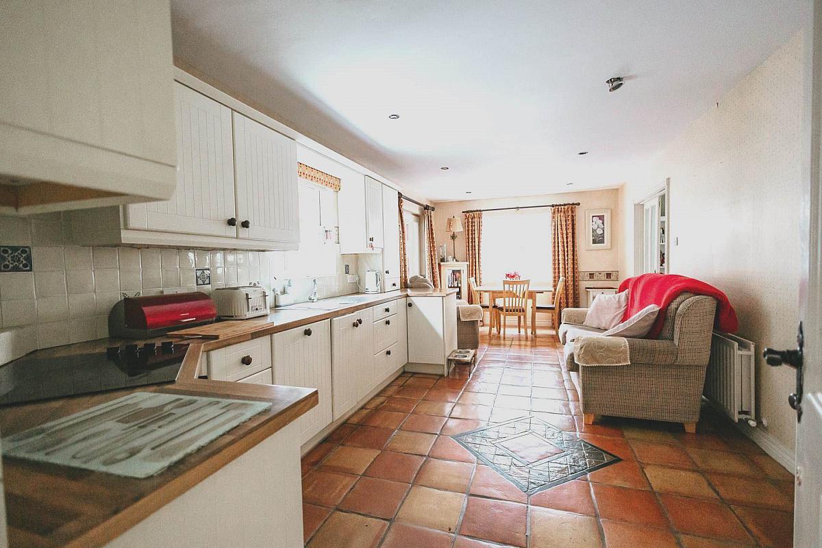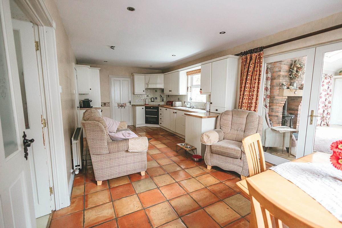 Open plan kitchen/dining area leading into the main family room with an open fire